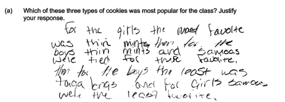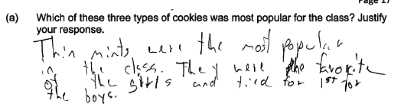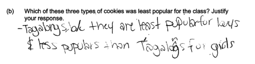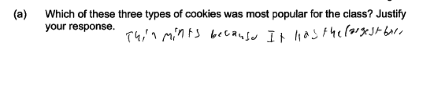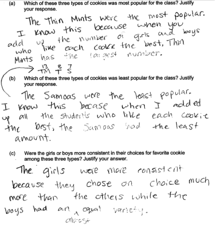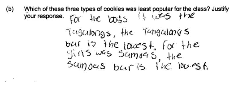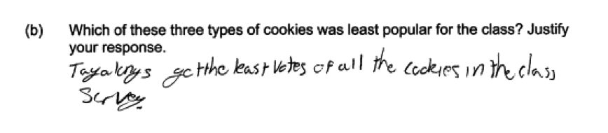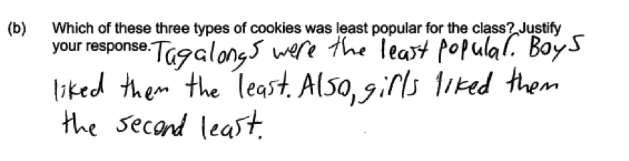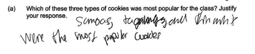 Finally, some students were not able to use the information provided to make a correct determination of the most and least popular types of cookies for the class. For example, consider the following three student responses below. In the first response, which is a response to part (a), the student is not able to determine which type of cookie is most popular and indicates that all three types were the most popular. The second and third responses below are responses to part (b) and both responses incorrectly identify Tagalongs as the least popular type of cookie.