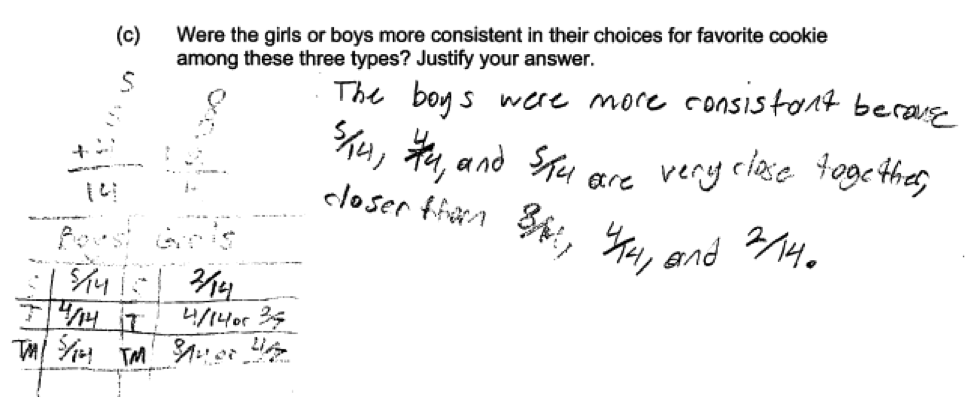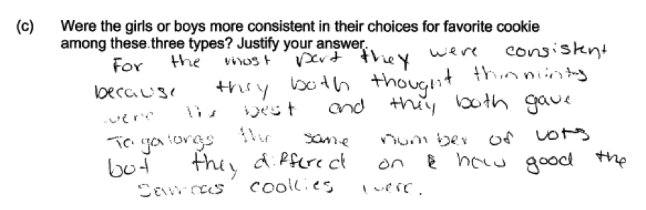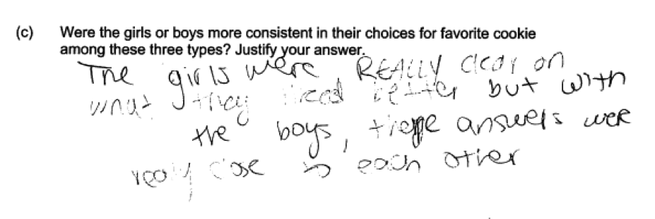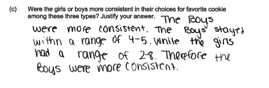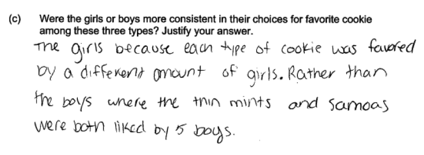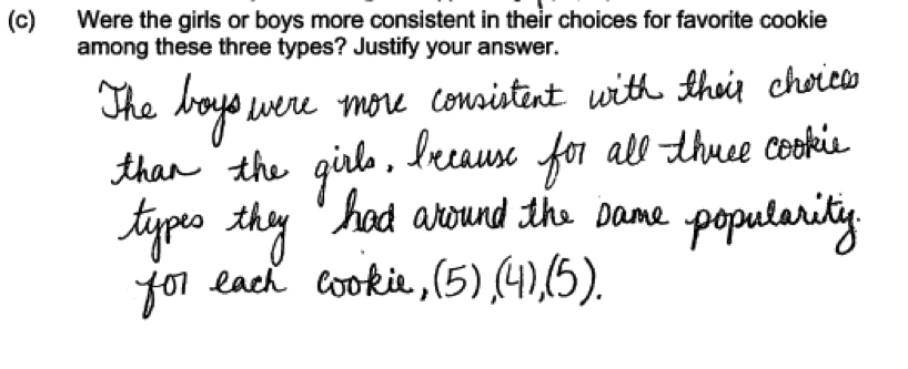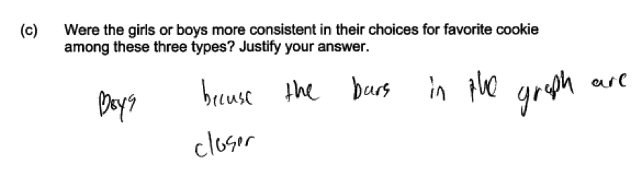 By far the most common error was for the student to interpret the frequencies (heights of the bars) as if they were numerical data values and to try to describe variability in the frequencies rather than variability in the actual data. This represents a conceptual error in thinking about the underlying data, which is categorical. This is illustrated in the following five student responses. Each of these responses make it clear that the student is looking at the category counts and think that the responses for boys are more consistent because the counts for the three different cookie types are quite similar. But for categorical data, this is actually an indication of variability in the data. For a data on a categorical variable, the least amount of variability possible occurs when all of the responses are in the same category.