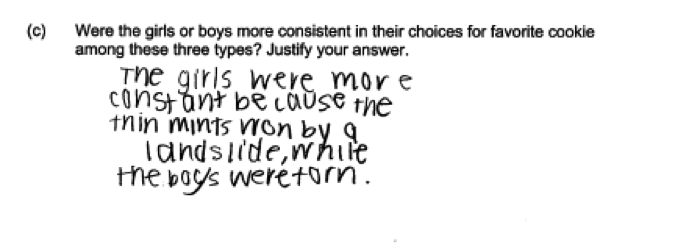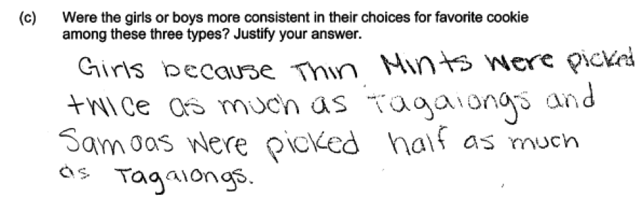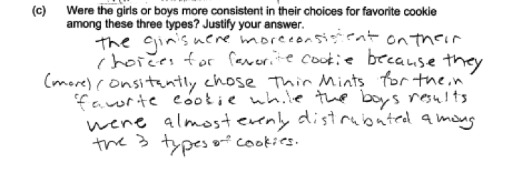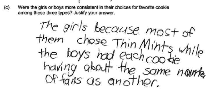 In the second student response below, parts (a) and (b) were scored as essentially correct. Part (c) was also scored as essentially correct because the justification indicates that the boys choices were “pretty even” (meaning that they choose each of the three types about the same number of times) but that girls had a clear preference for Thin Mints. This student response also received a score of 4.