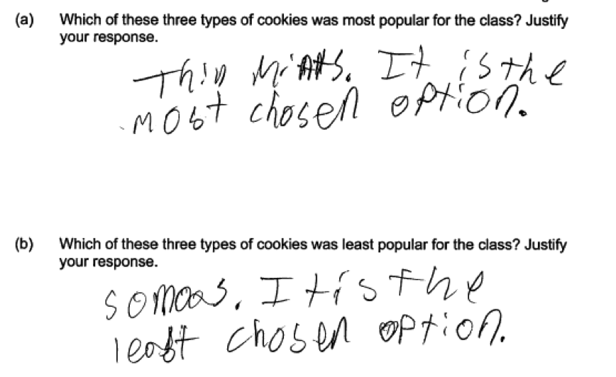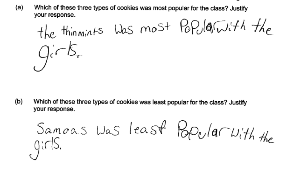 Other students provided a justification that was judged to be weak or that did not make it clear that the answer was about the entire class. For example, the following two student responses were scored as only partially correct. In the first response (part (a)), the justification for Thin Mints in part (a) is “Thin mints because it has the largest bar.” In this response, it is not clear that the choices for girls and the choices for boys were combined. In the second student response (parts (a) and (b)), the justifications only states that the selected cookie type was “the most chosen option” or “the least chosen option.” As with the first response, there is not a clear indication that the counts for the girls and the counts for the boys were combined.