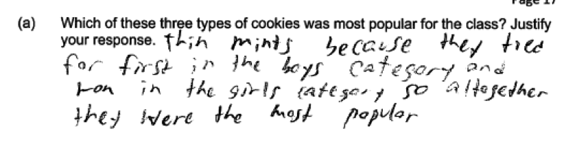 To be considered essentially correct for either part (a) or part (b), the justification needs to make it clear that the counts for girls and the counts for boys were combined in order to reach an answer based on data for the entire class. This was sometimes a difficult call to make when scoring this question. For example, consider the following two responses to part (a) that are quite similar. The first was scored as essentially correct for part (a) because of the last part of the answer: “so altogether they were the most popular.” The second was scored as only partially correct, because it does not make it clear that information from the girls and from the boys was combined in order to reach an answer.
