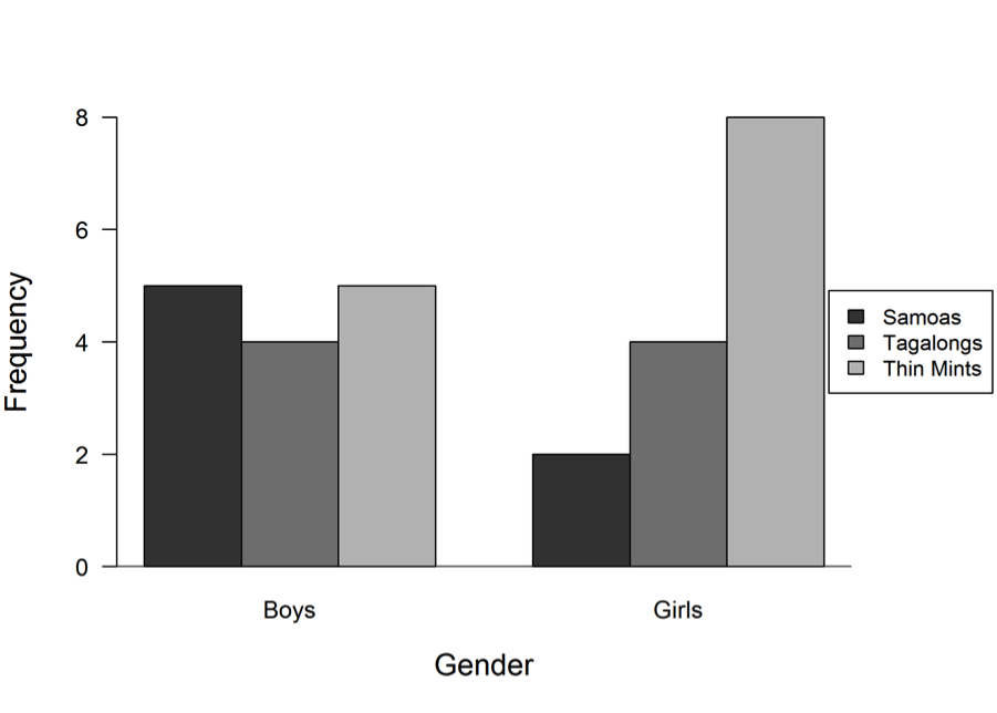 Samoas, Tagalongs, and Thin Mints are the most popular types of Girl Scout cookies in a school. Students in a sixth-grade class wanted to know which of these three types of cookies their classmates like the most. They also wanted to know how the popularity of these three types of cookies compared between boys and girls. Data from a class survey are summarized in the bar graphs below.