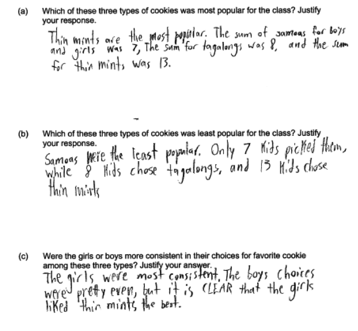 In the first student response below, the student identifies Thin Mints as the most popular cookie type in part (a) and Samoas as the least popular cookie type in part (b). These answers are justified by referring to correct class frequencies that are shown at the end of the response to part (a). Both parts (a) and (b) were scored as essentially correct. In part (c) the student correctly identifies girls as having the most consistent choice for favorite cookie based on having a clear preference for one type of cookie. The student also compares this to the distribution of cookie choices for boys, saying “while the boys had an almost equal variety.” Part (c) was scored as essentially correct, and with all four parts essentially correct, this student response received a score of 4.