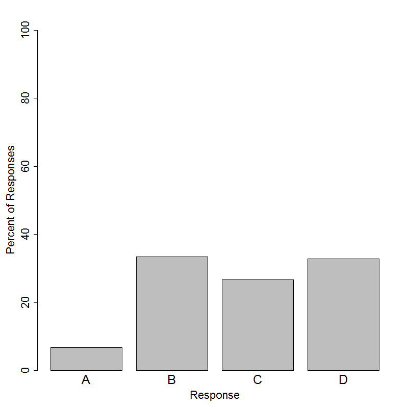About 33% of students answered this item correctly. Only 7% of students selected choice (A). This choice is incorrect because the variable of interest is not the type of bicycle, but the type of braking that will be used. The brand of bicycle would be important if the student was interested in, for example, which brand of bike stops the fastest using the foot brake. Choice (C) was selected by 27% of the students. The speed of the bicycle is an important factor in braking distance, however, the student attempted to ride the bicycle at “full speed” in each of the trials. Therefore, this variable is held constant and does not determine the treatments in the study. Choice (B) was actually the most popular of all the answers to this item with slightly over 33% of students selecting it. The distance it takes to stop is the variable that will be recorded in the experiment and will be used to determine which type of braking will stop faster, however, it is not the variable that is systematically changed in this study, which is the one that determines the treatments.
