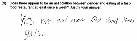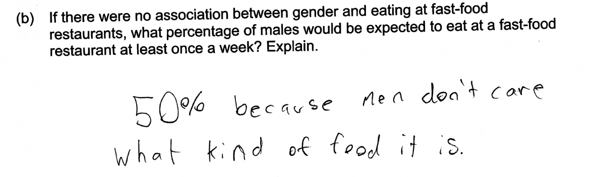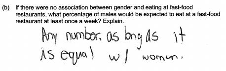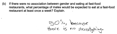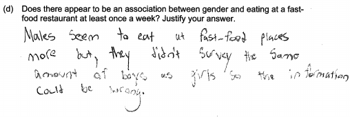 In part (b), a common misconception was that no association exists between gender and eating fast-food at least once per week only when the response percentages are 50% for each possible response category. Students making this error focused on dividing the responses up evenly among the possible response categories. The following two student responses are typical of those that made this error. Both of these responses were scored as incorrect for part (b).
