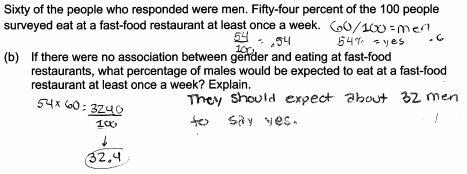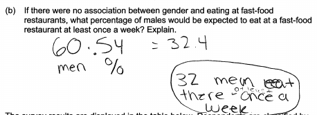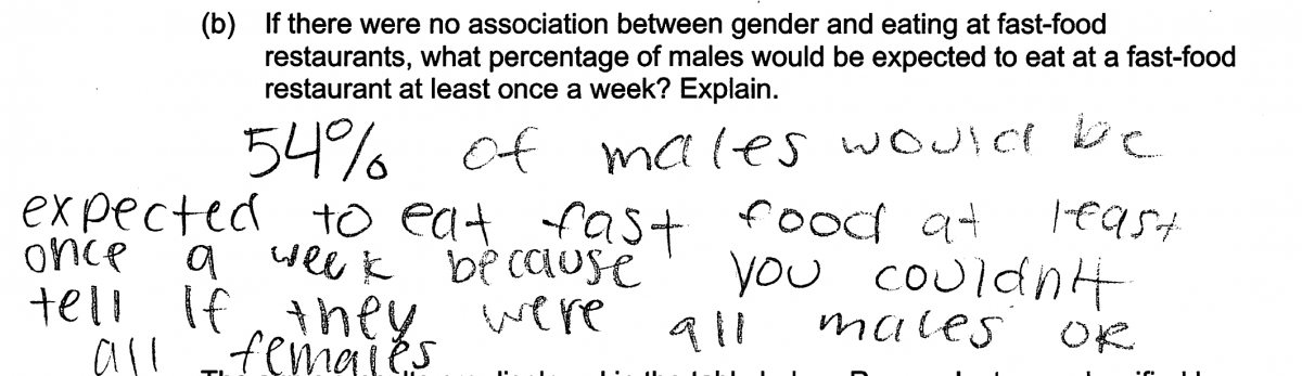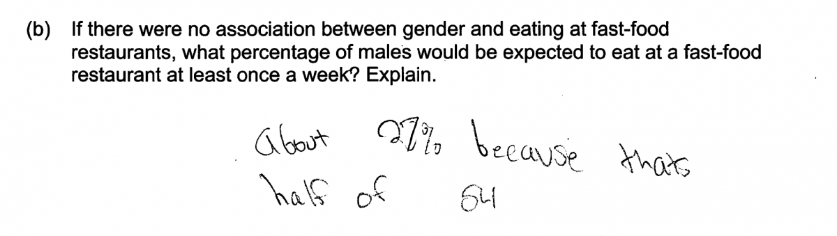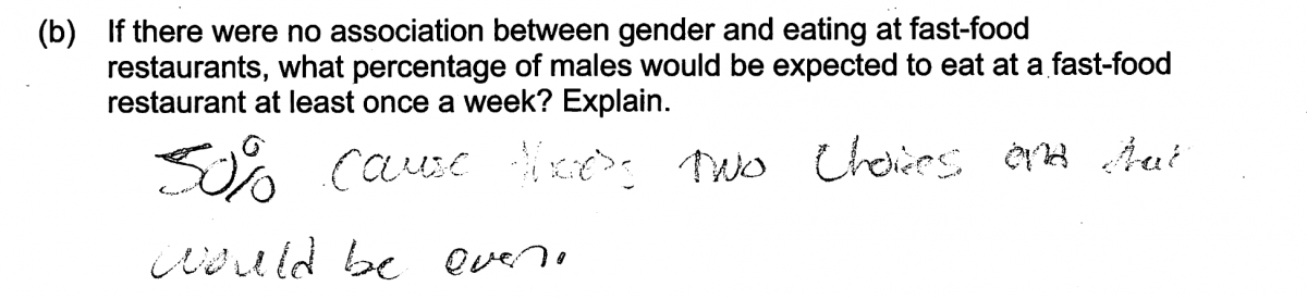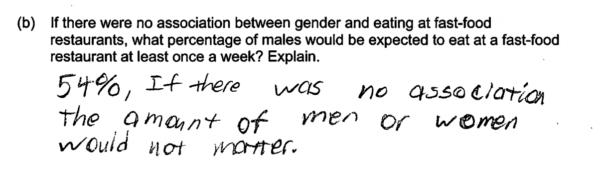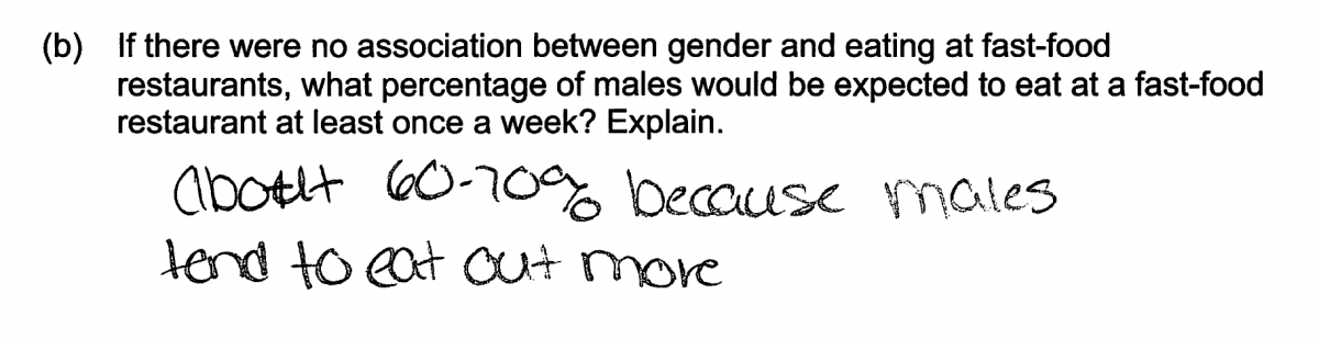 Some students believed that the 54% who reported eating fast food at least once per week would need to be divided evenly between males and females if there was no association, overlooking the important fact that there were more males than females in the group surveyed. This incorrect reasoning is illustrated by the following student response which was scored as incorrect for part (b).