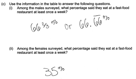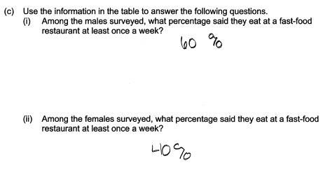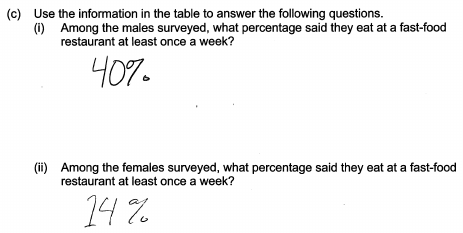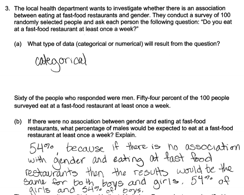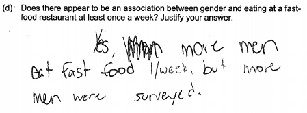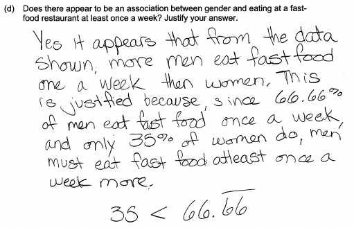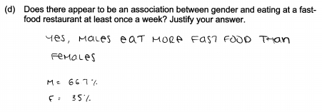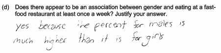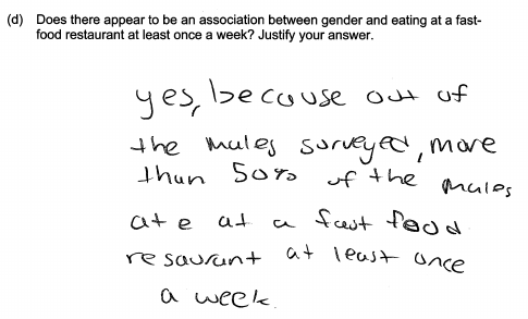 In the response below, the justification is that “males eat more fast food than females” which is not exactly what is being measured, i.e. this response focuses on the amount of fast food eaten rather than the categorical response to the question about whether fast food is eaten at least once per week. While this or a similar answer would be scored as essentially correct if an explicit, appropriate comparison of percentages was made, simply listing the percentages together is not sufficient for a comparison.