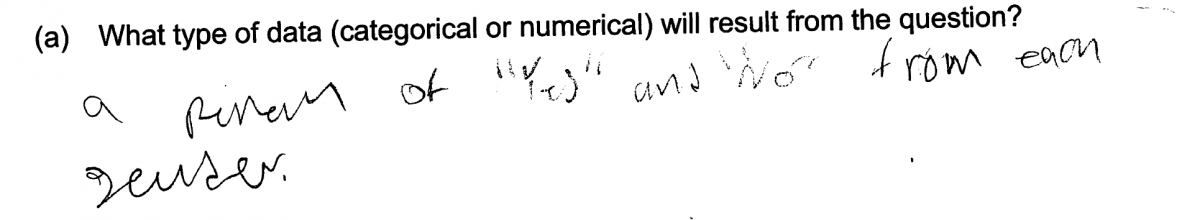 Other students did not understand the question or did read the question clearly and responded by indicating the two possible response categories (yes, no) rather than the data type of categorical or numerical. This error is illustrated in the following student response.