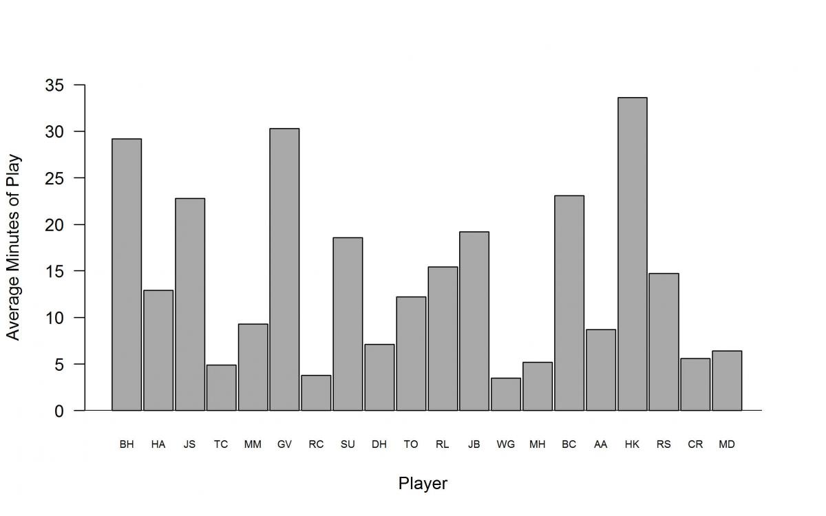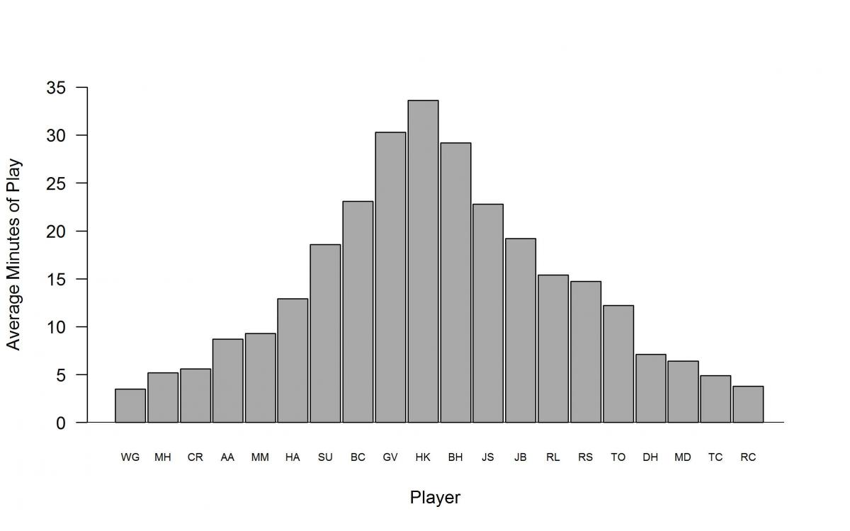 Average minutes of play | 29.2 | 12.9 | 22.8 | 4.9 | 9.3 | 30.3 | 3.8 | 18.6 | 7.1 | 12.2 |