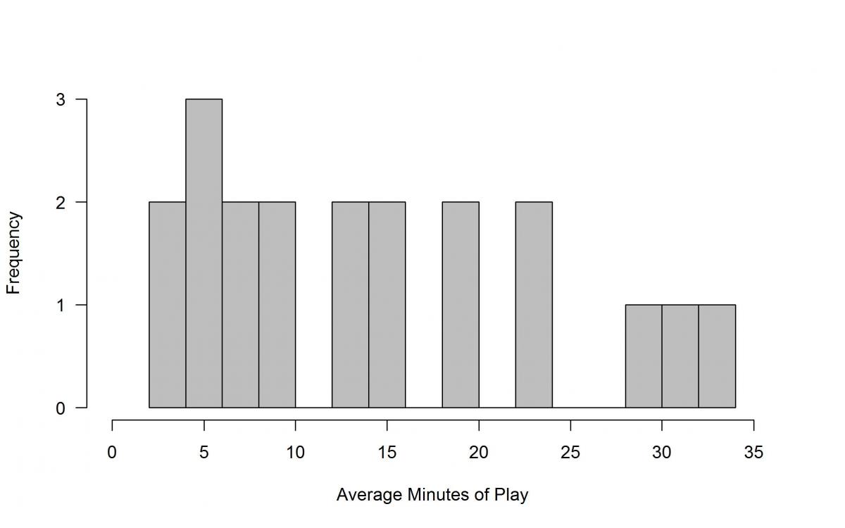 It is common for students to want to preserve all information about individuals when creating a graph of data, even if the information is not relevant to the question or problem that is posed. Options (A) and (C) were designed to mimic the types of plots that might be naïvely produced using popular spreadsheet programs, and Option (D) is essentially the same plot as (A) but deliberately rearranged to resemble a bell-shaped distribution. Options (A) and (D) preserve the connection between each player and the player’s average minutes of play, while Option (C) preserves the exact value of each player’s average minutes of play. However, being able to know the average minutes of play for each individual player is not needed to answer the question, and preserving this information actually produces plots that do not allow us to see the center, shape, and spread of the variable “average minutes of play”.