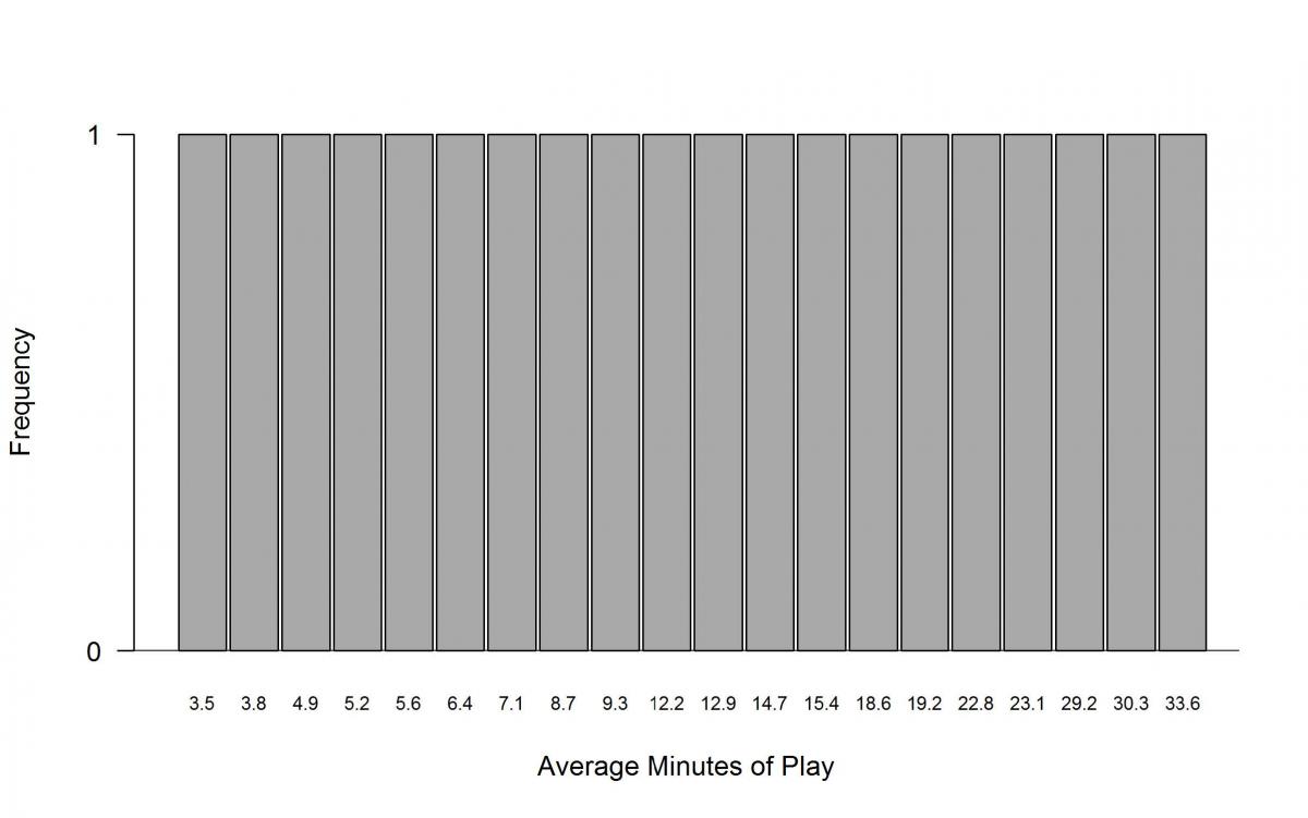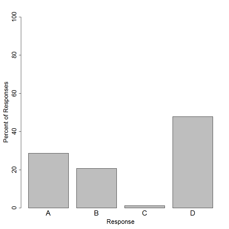 The most popular choice on this item was Option (D), with a response rate of about 48%. Choice (D) puts each player on the x-axis and their respective average minutes of play on the y-axis. While the plot appears to be symmetric and is shaped like a bell, the order of the players on the x-axis does not actually matter and could be rearranged in any order. This plot does not allow us to clearly see any measure of center for the average number of minutes played by the players and is likely chosen by students who know enough about statistics to recognize the bell shape but still have gaps in their understanding. Option (A) was the second most selected response with a response rate of about 29%. This plot is the same type of plot as in Option (D) with the players arranged on the x-axis in the same order as in the table. Only about 1% of students selected Option (C), which is a bar graph using each player’s average minutes of play as a label for each bar. While the bars are arranged in increasing order, they are evenly spaced apart, which does not accurately reflect the differences between average minutes played for the players and will not allow us to see the center, shape, or spread of the variable of interest.