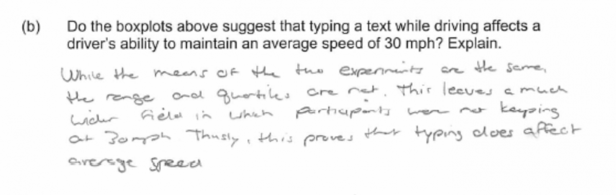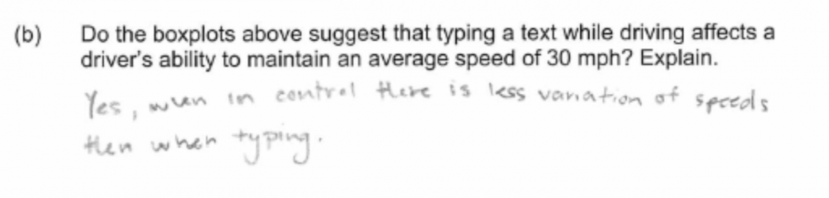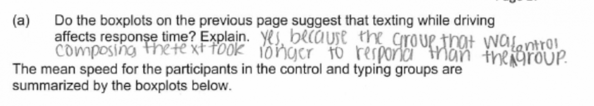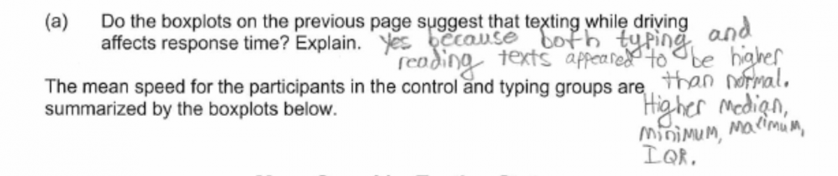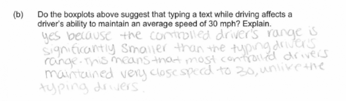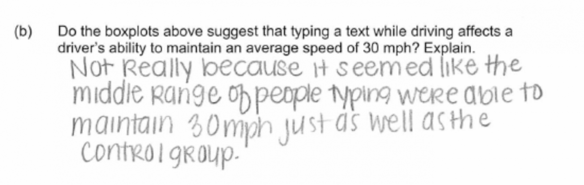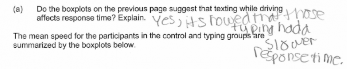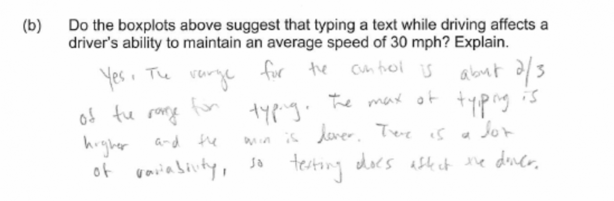 Part (b) asks students to use boxplots to reach an informal conclusion regarding whether typing affects a driver’s ability to maintain an average speed of 30 mph and to justify the conclusion. The three student responses below each received a score of essentially correct for part (b). These responses indicate that typing does affect a driver’s ability to maintain a speed of 30 mph and note that the variability of mean speed is smaller for the control group than for the typing group.  The conclusions are supported by pointing out that the range (a specific aspect of the boxplot) is greater for the typing group.