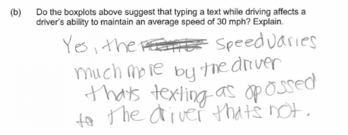 One final misconception is interpreting observed differences in the boxplots as evidence of proof. While this error was not very common, it does represent a serious misconception in terms of the types of conclusions that can be drawn from data. For example, in the following student response, the first part of the response correctly notes that the centers of the two groups are similar but that they differ in variability. But the student then goes on to say that “this proves that typing does affect average speed.” Based on just a visual comparison of boxplots, this is not a reasonable conclusion.