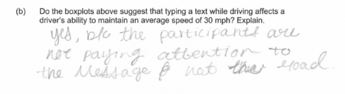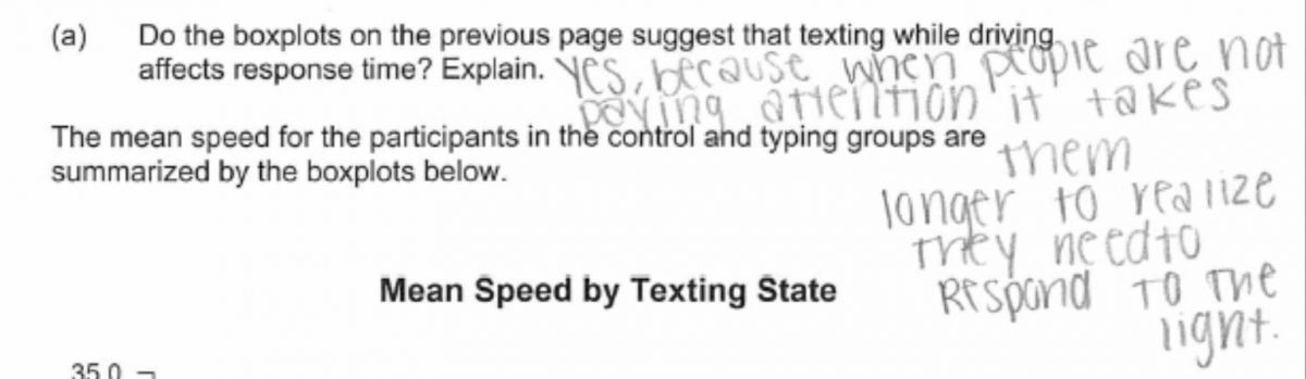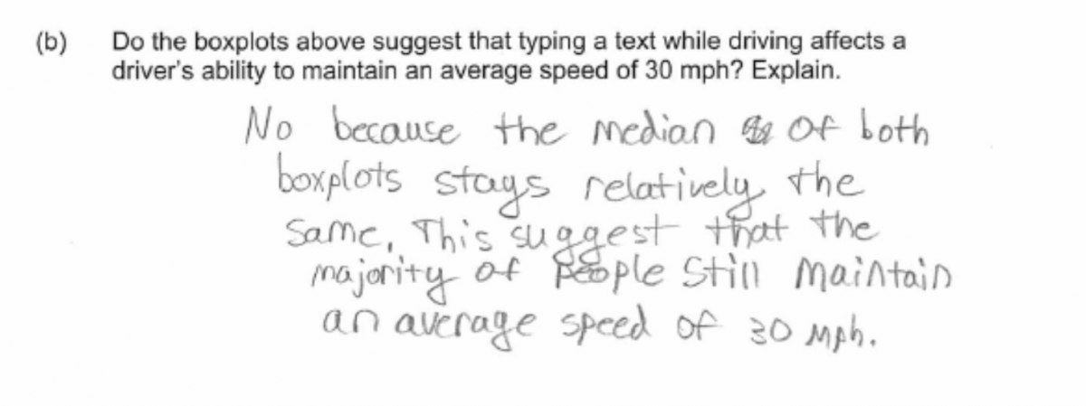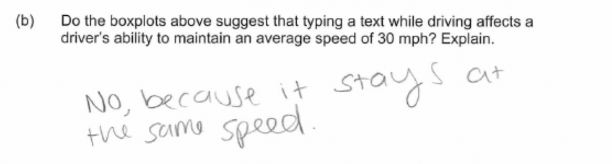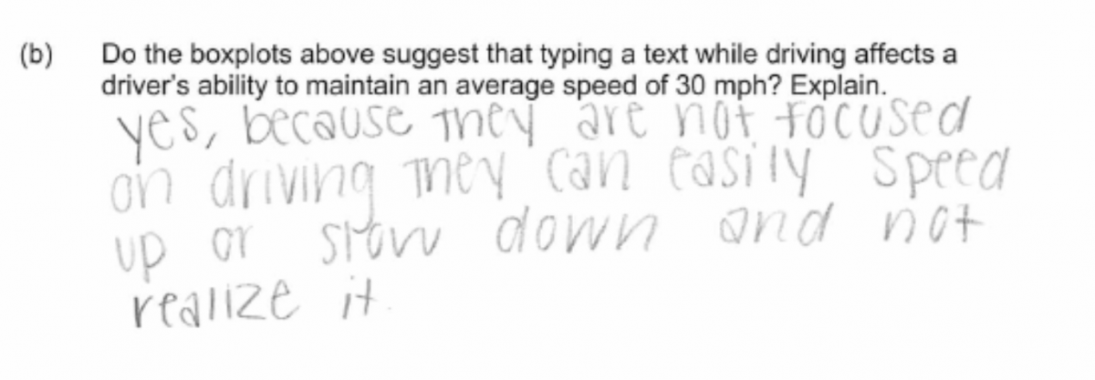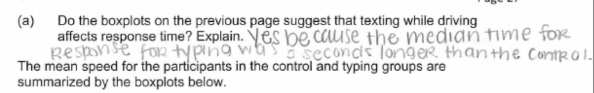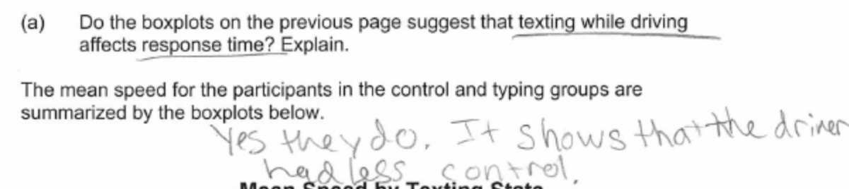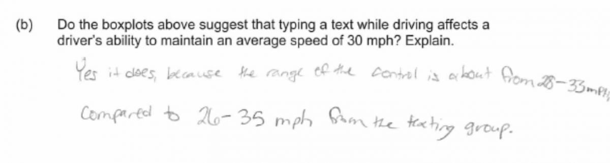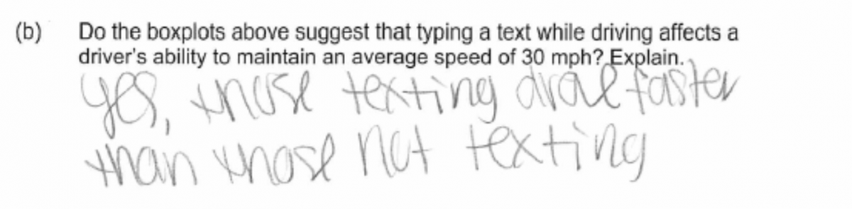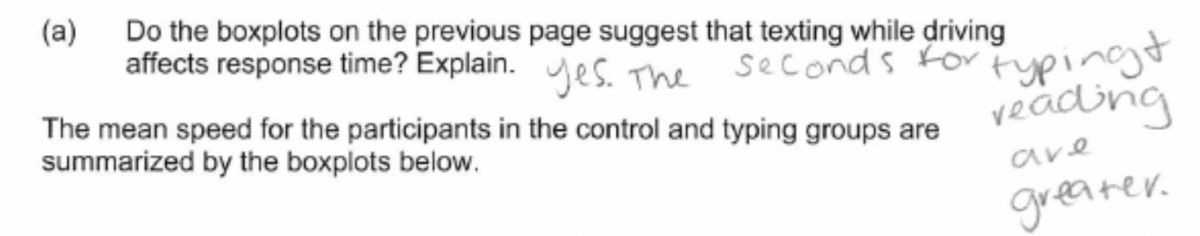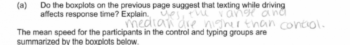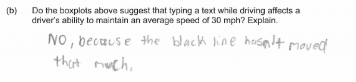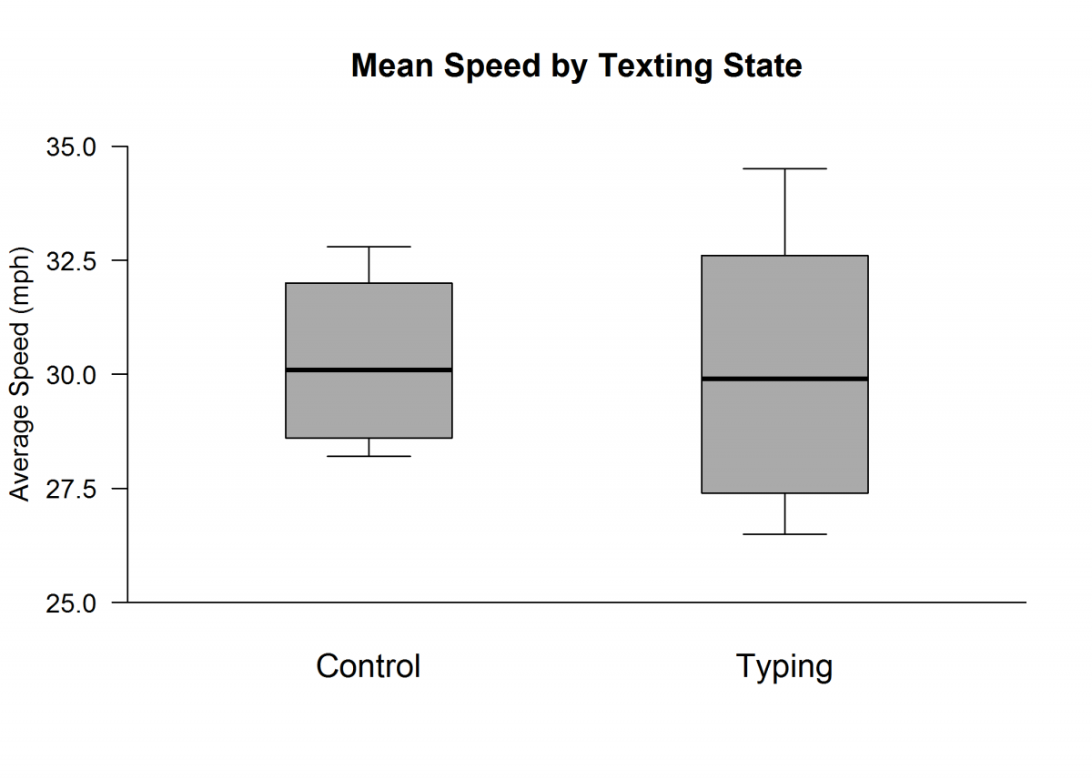 (b) Do the boxplots above suggest that typing a text while driving affects a driver’s ability to maintain an average speed of 30 mph? Explain.