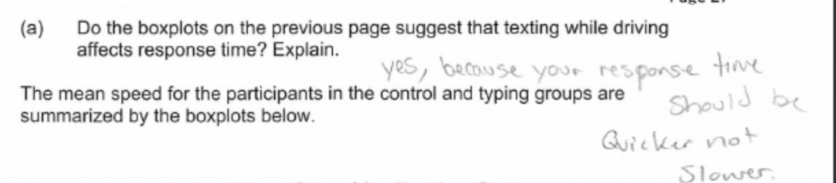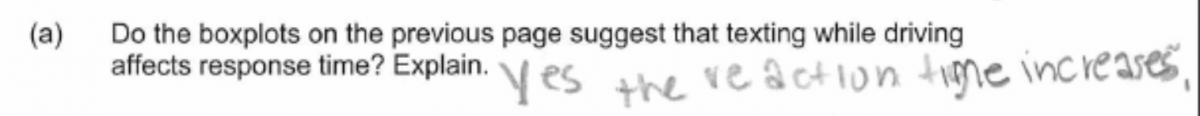 (a) Do the boxplots on the previous page suggest that texting while driving affects response time? Explain.