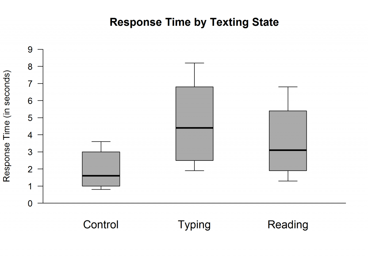 Response times (in seconds) for the participants in each texting state are summarized by the three boxplots below.