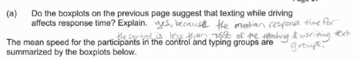 Part (a) asks students to use given boxplots to compare a control group to a typing group and a reading group to reach a conclusion about whether texting while driving affects response time and to justify the conclusion. The two student responses below each received a score of essentially correct for part (a). In the first response, the student indicates that texting does affect response time and supports that conclusion by noting that the median of the control group data is less than the lower quartiles of the reading and the typing distributions. The response also refers to specific aspects of the boxplots (median, quartiles) and compares the control to both of the other groups. The second response also indicates that texting does affect response time and references both the typing and reading groups. The conclusion is supported by noting that the median, minimum, maximum and IQR of both the typing group and the reading group are greater than the corresponding values for the control group.