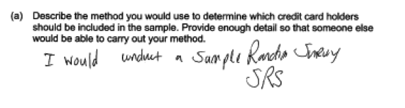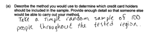 Responses that were not scored as essentially correct in part (a) generally made one of two common errors. Some responses indicated random selection, but did not adequately describe a method that could be used to carry out the selection even though the question asked for such a description. The three student responses shown below were scored as partially correct for this reason.