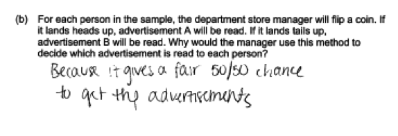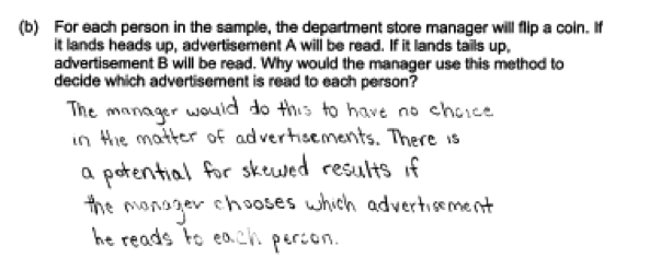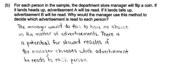 A number of students indicated that the reason for using the method described to assign card holders to one of the two advertisements was so that the manager would not be able to influence the results. While this is a correct statement, it is not sufficient and fails to recognize the impact on the type of conclusion that can be drawn. This is illustrated in the following two student responses, both of which received a score of partially correct for part (b).