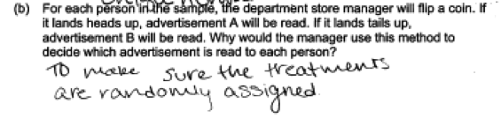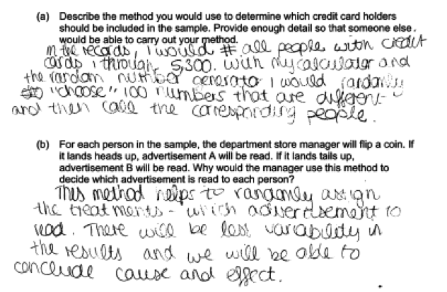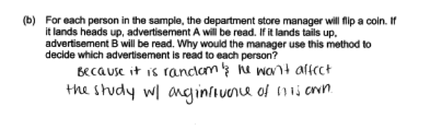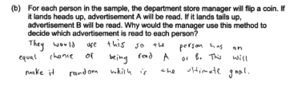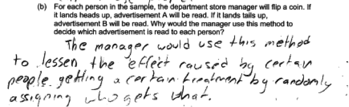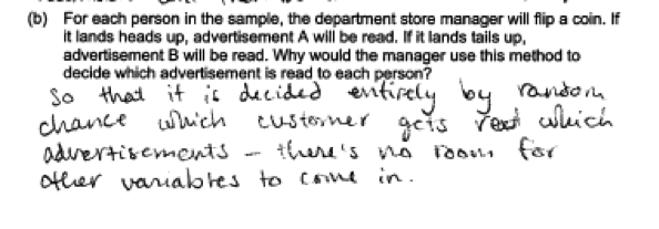 The two student responses below illustrate this. Both recognize that the method described results in random assignment to treatments, but neither links this to enabling the manager to reach a cause-and-effect conclusion. For this reason, both of these responses were considered to be only partially correct for part (b).