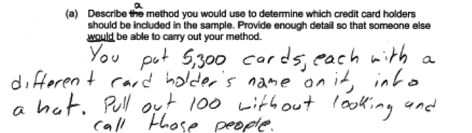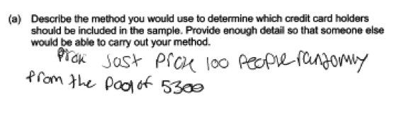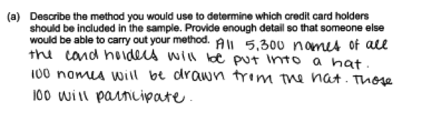 In part (a), many students described methods for selection that were equivalent to writing all 5300 names on slips of paper, putting the slips into a hat, and then selecting 100 names. Such responses demonstrated understanding of random selection and were considered to be essentially correct as long as the response indicated that the slips would be mixed before the 100 manes were selected. The response shown below was scored as partially correct, but would have received a score of essentially correct had it included mixing.