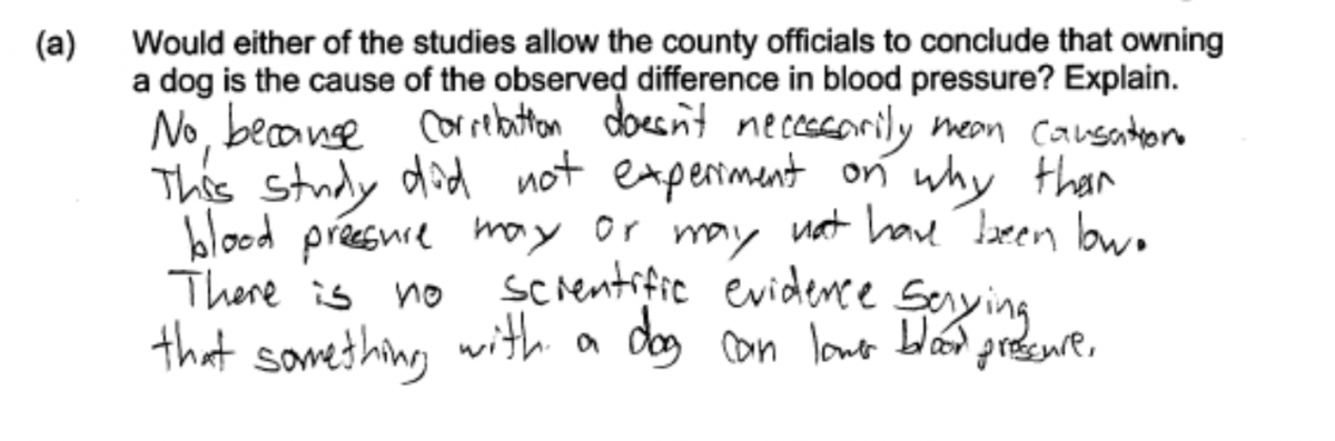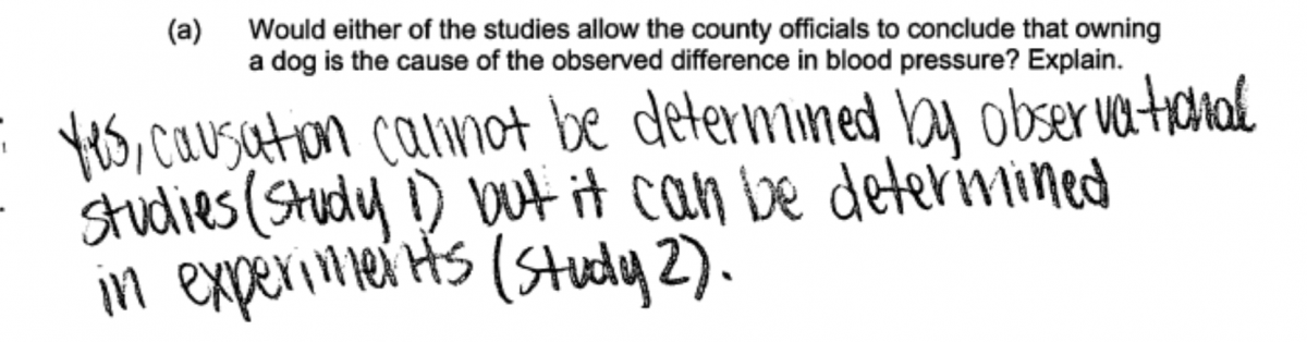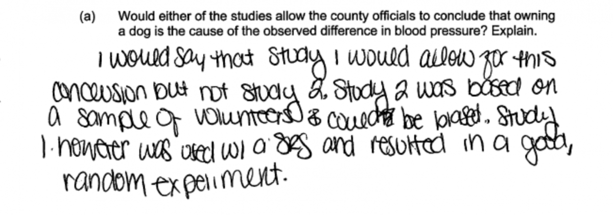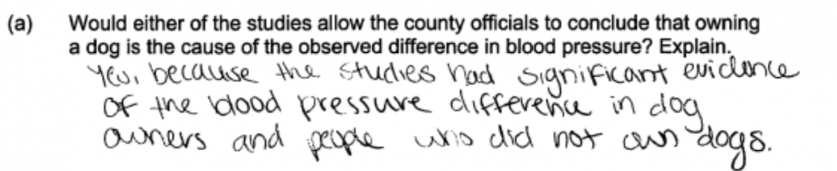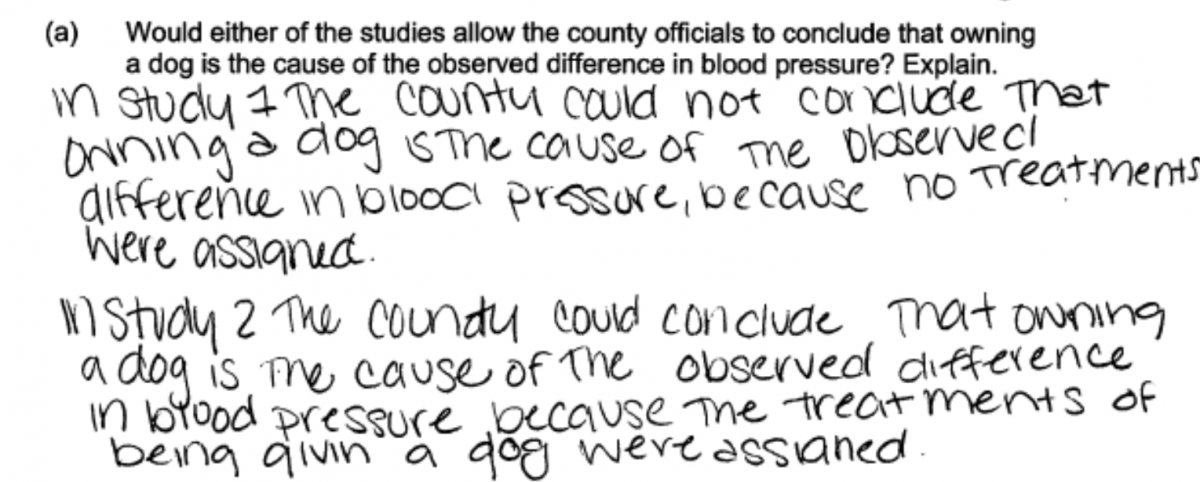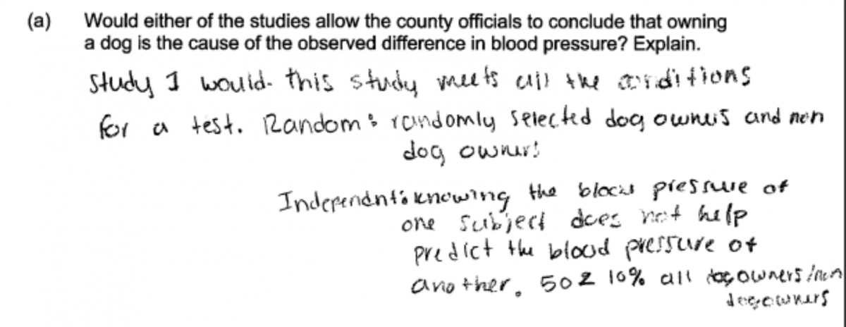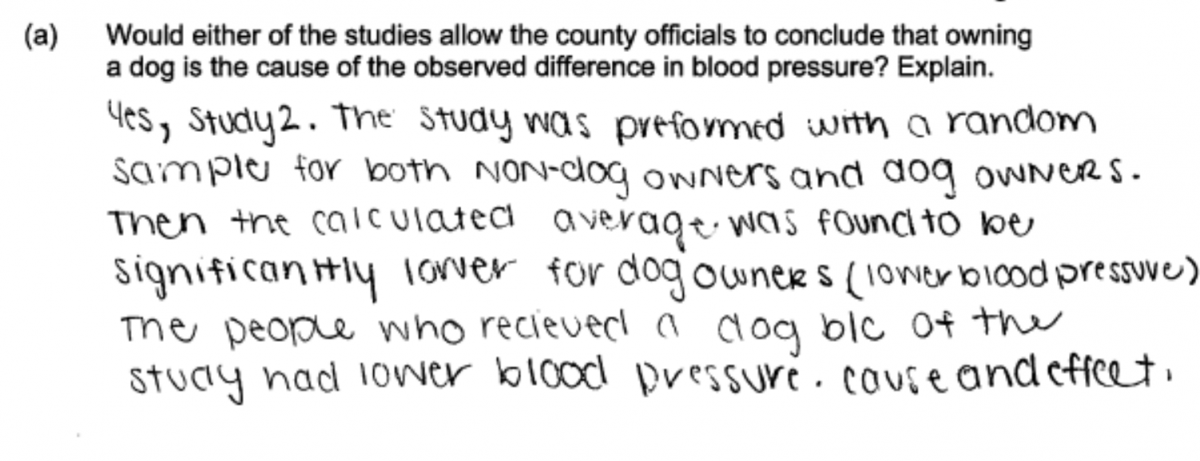 Part (a) asks to consider two study descriptions and to indicate if it is possible to draw a cause-and-effect conclusion (that owning a dog is the cause of the observed difference in blood pressure for the two groups) based on the results of either of these studies. An ideal response to part (a) is one that recognizes that cause-and-effect conclusions can only be drawn from the results of a well-designed experiment. Because Study 1 is an observational study and Study 2 is an experiment, a response that indicates that the stated conclusion is only appropriate for Study 2 because it was an experiment and because subjects were randomly assigned to the two treatment groups (dog and no dog) is essentially correct. To be considered essentially correct for part (a), the explanation given must note the role of random assignment in the study design.
