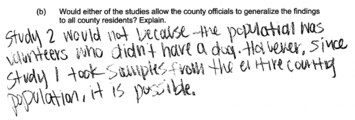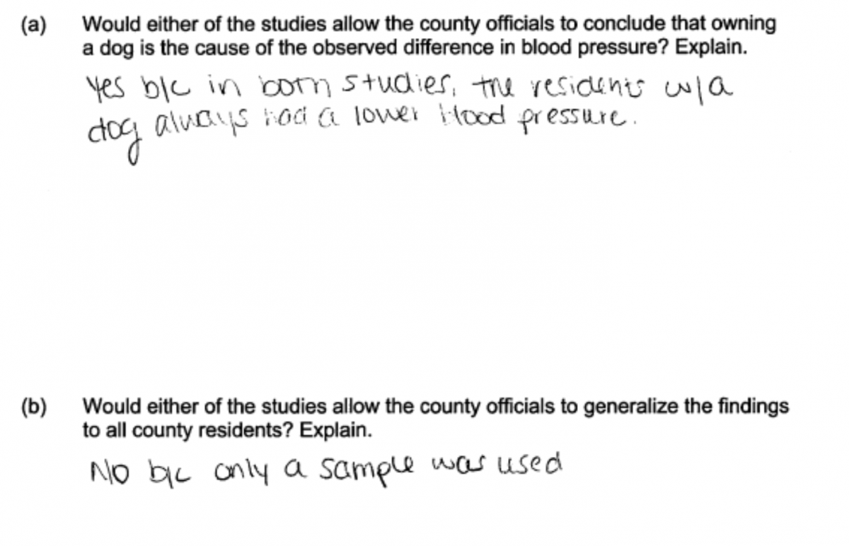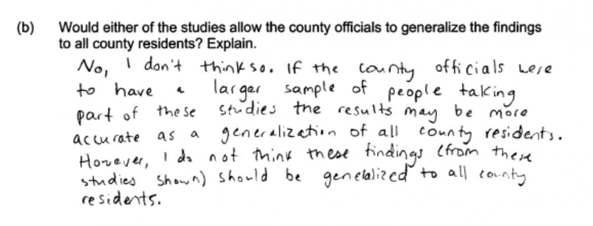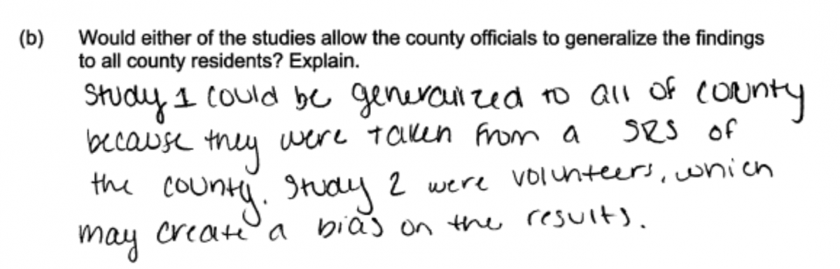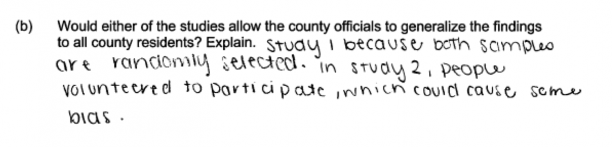 The most common student error in part (b) was failure to specifically appeal to random selection as the explanation for why results could be generalized from Study 1. For example, the following student response was scored as only partially correct because it does not mention that the samples were random samples. If the response had used “random samples” rather than “samples” in the last sentence of the response, it would have been scored as essentially correct.