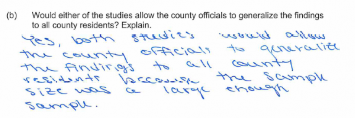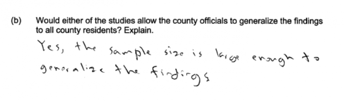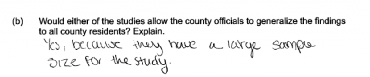 The other two common student errors on part (b) were related to thinking that sample size is what determines whether or not a sample is representative of the population. Some students indicated that they believed that results could be generalized because the sample sizes were large. Others indicated that the results could not be generalized because the samples were not large enough. But in both cases, students making either of these two errors failed to recognize the importance of random selection.