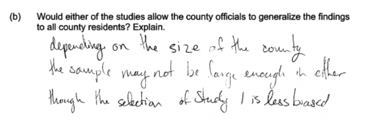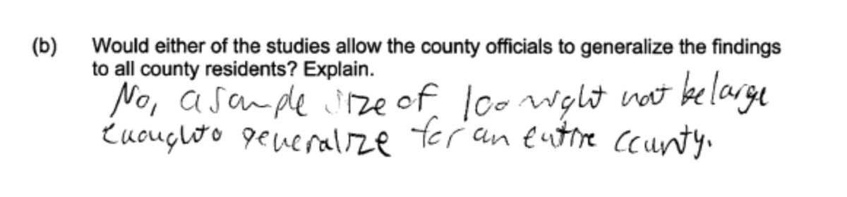 The following two student responses show a good understanding for part (b) of this question. These responses recognize the need for random samples in order to generalize from a sample to a larger population. Both of these responses were scored as essentially correct for part (b). (Note that the second student response uses “SRS” which is a commonly used abbreviation for simple random sample.)