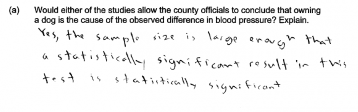 A relatively common student misunderstanding was to confuse statistical significance with causation. Because the question wording used “significantly lower,” these students used statistical significance as the justification of a causal conclusion. This misunderstanding is illustrated in the following two student responses, which were both scored as incorrect for part (a).