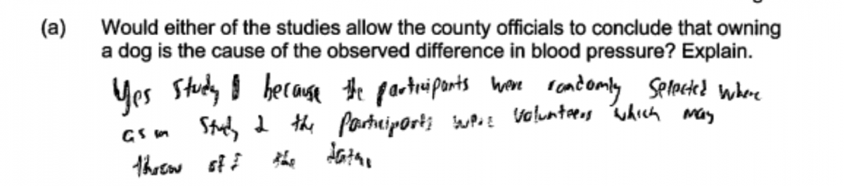 Another misunderstanding is illustrated in the following student response. This response indicates that the student believes that it is random selection (rather than random assignment) that is needed in order to draw a causal conclusion. For this reason, the student incorrectly selects Study 1 in the response to part (a).