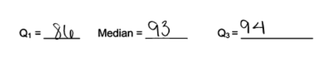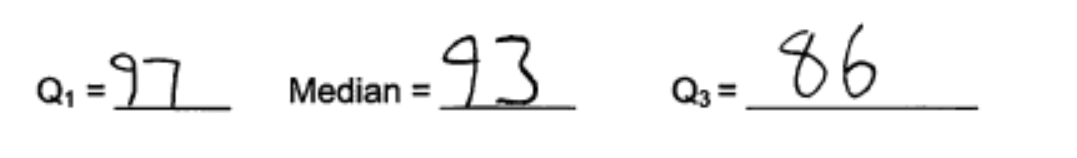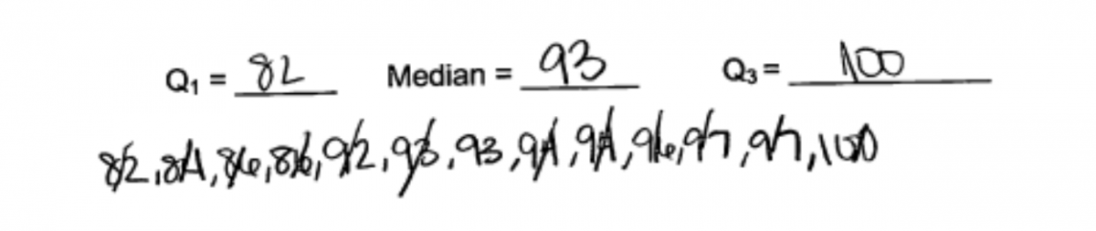 Some students also confused Q1and Q3. This is illustrated in the following student response, which was scored as partially correct for part (a). Students making this mistake were generally able to produce a correct boxplot in part (b). Note that this student has also made a minor error in calculating the upper quartile to be 97 rather than 96 or 96.5.