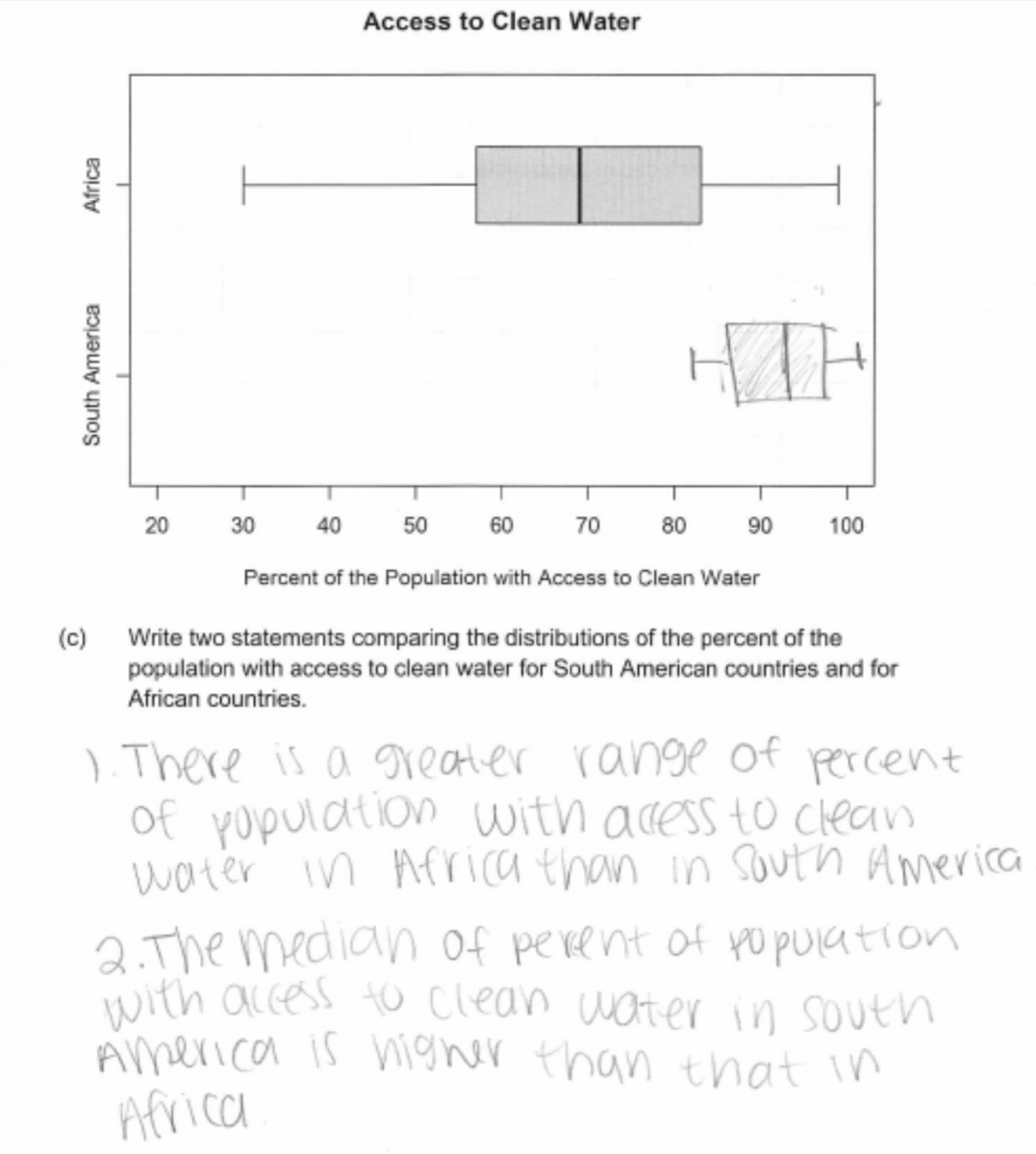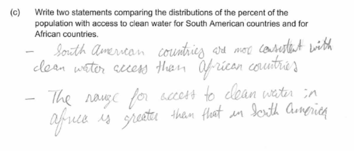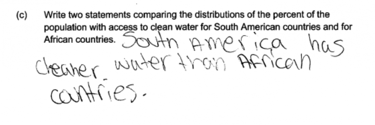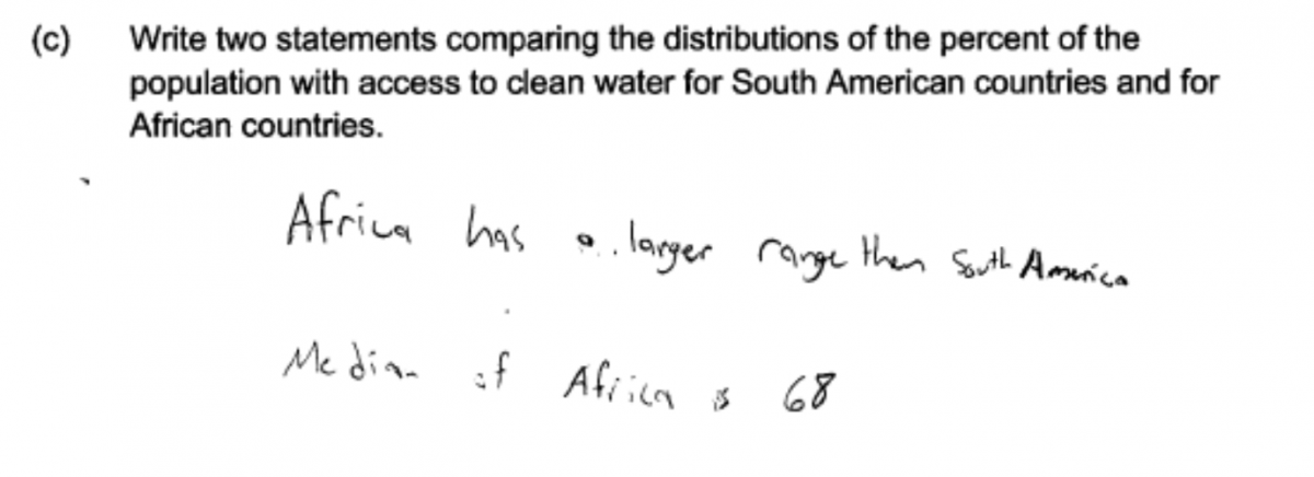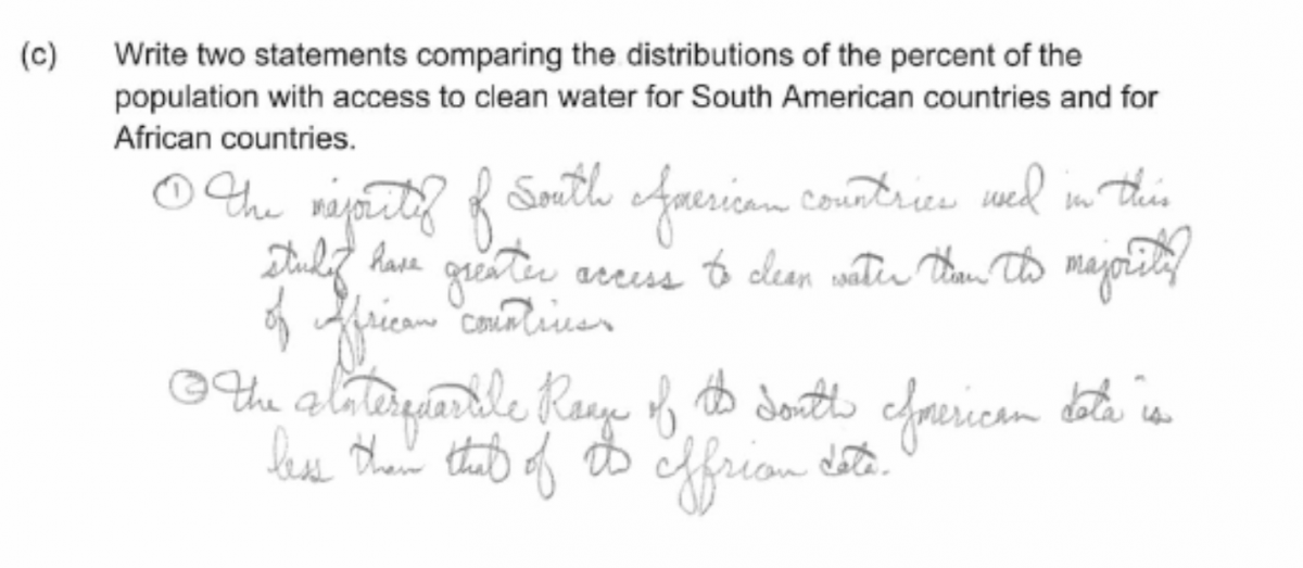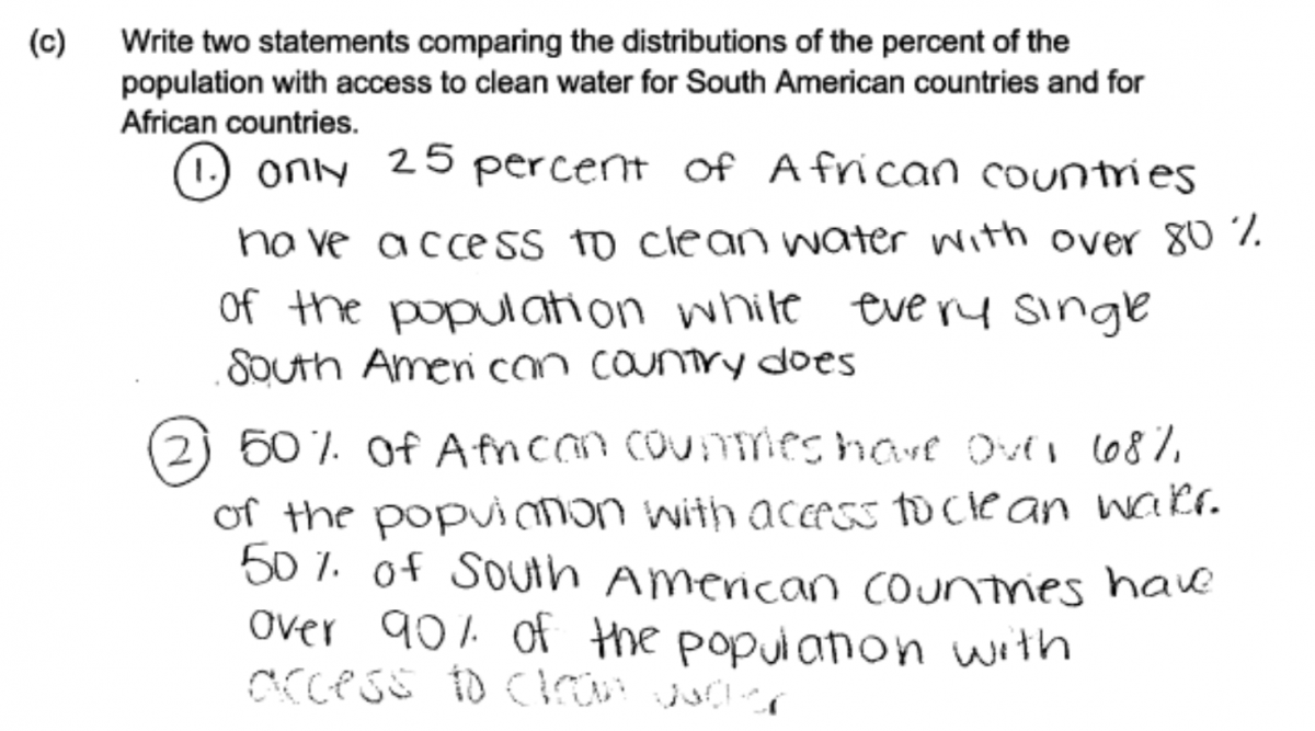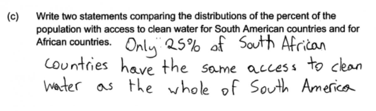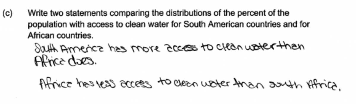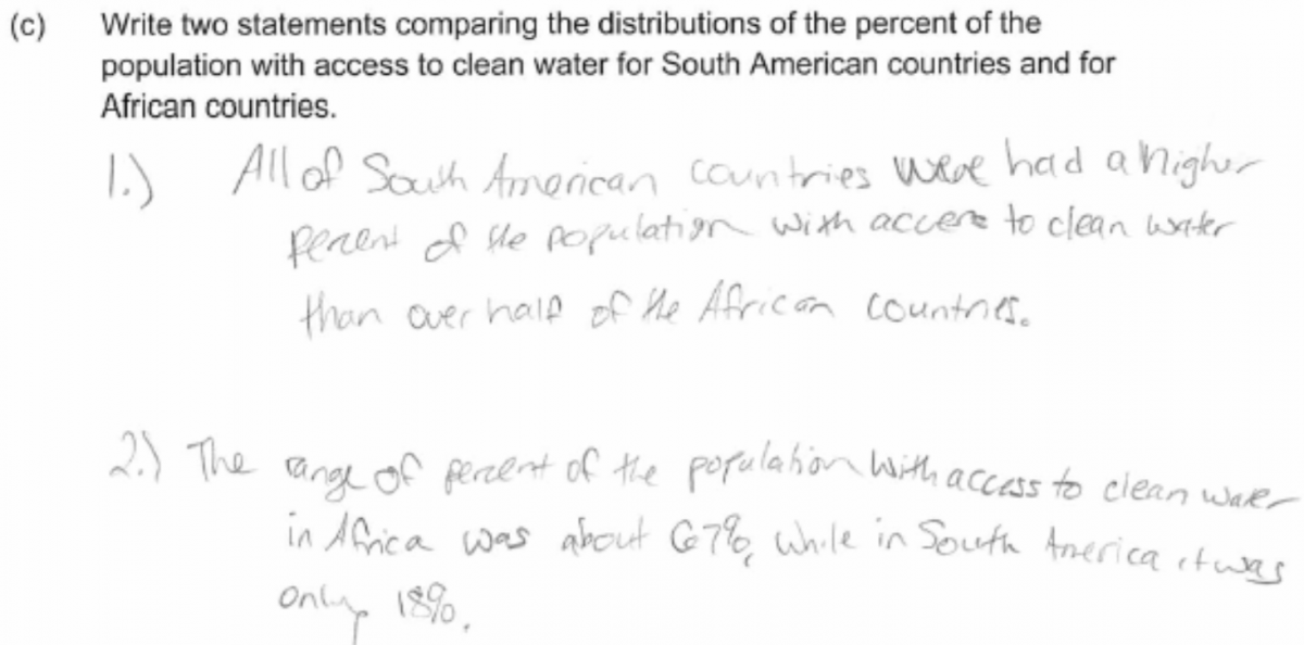 There were a number of ways that students could write statements comparing the two distributions in part (c). For example, consider the two statements given in the following student response. The first statement is correct and is based on noting that the minimum for the South American countries is about equal to the upper quartile for the African countries. The second statement is equivalent to comparing the medians of the two distributions. This response received a score of essentially correct for part (c).