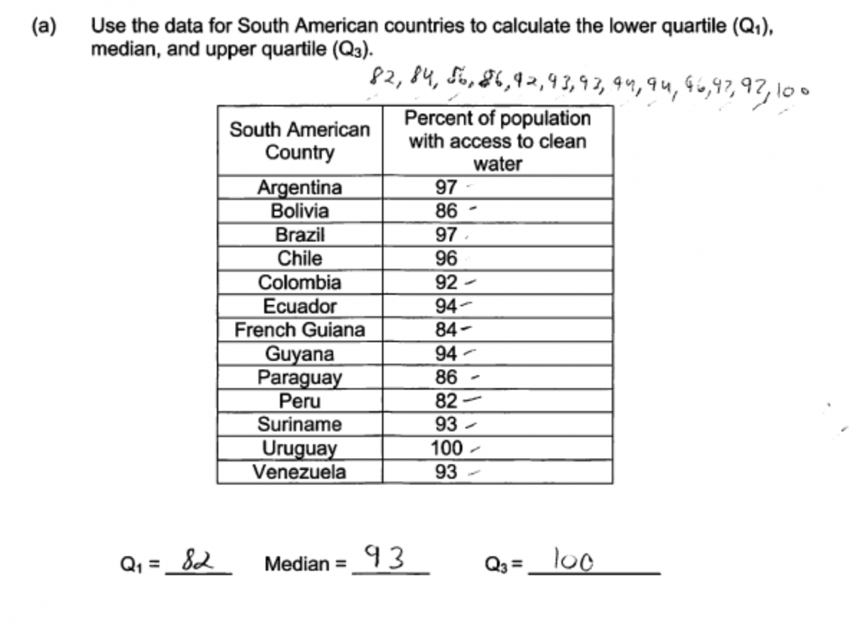 Part (a) asks students to calculate the median and quartiles for a data set consisting of the percent of the population with access to clean water for 13 countries in South America. There are two common methods for finding the quartiles of a data set, and they sometimes result in different values for the quartiles. Both methods are based on dividing the data set into a lower half and an upper half. The only difference is what is done with the median value when the number of observations in the data set is odd. One method excludes the median for the lower and upper halves when finding quartiles and the other method includes the value of the median in both the lower half and the upper half when finding the quartiles. For this data set, both methods result in a value of 86% for the lower quartile. The value for the upper quartile is 96.5% for the method that excludes the median from both halves and it is 96% for the method that includes the value of the median in both halves. Either answer for the upper quartile is considered to be correct.