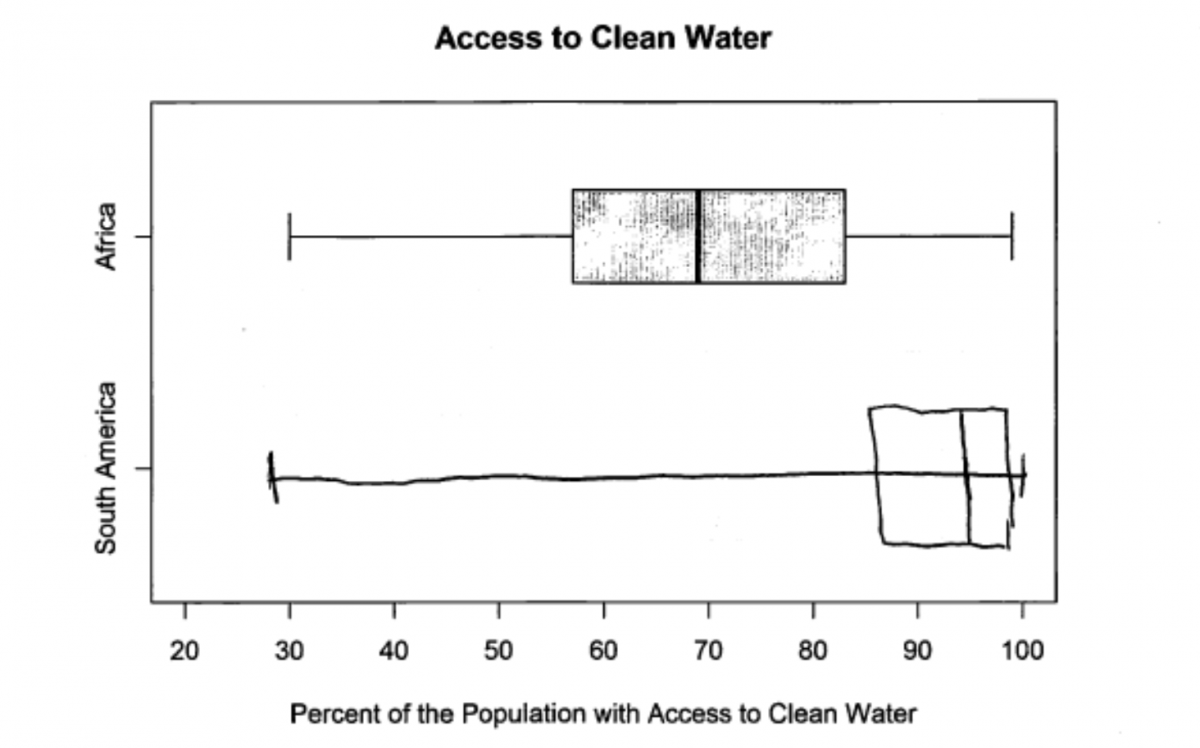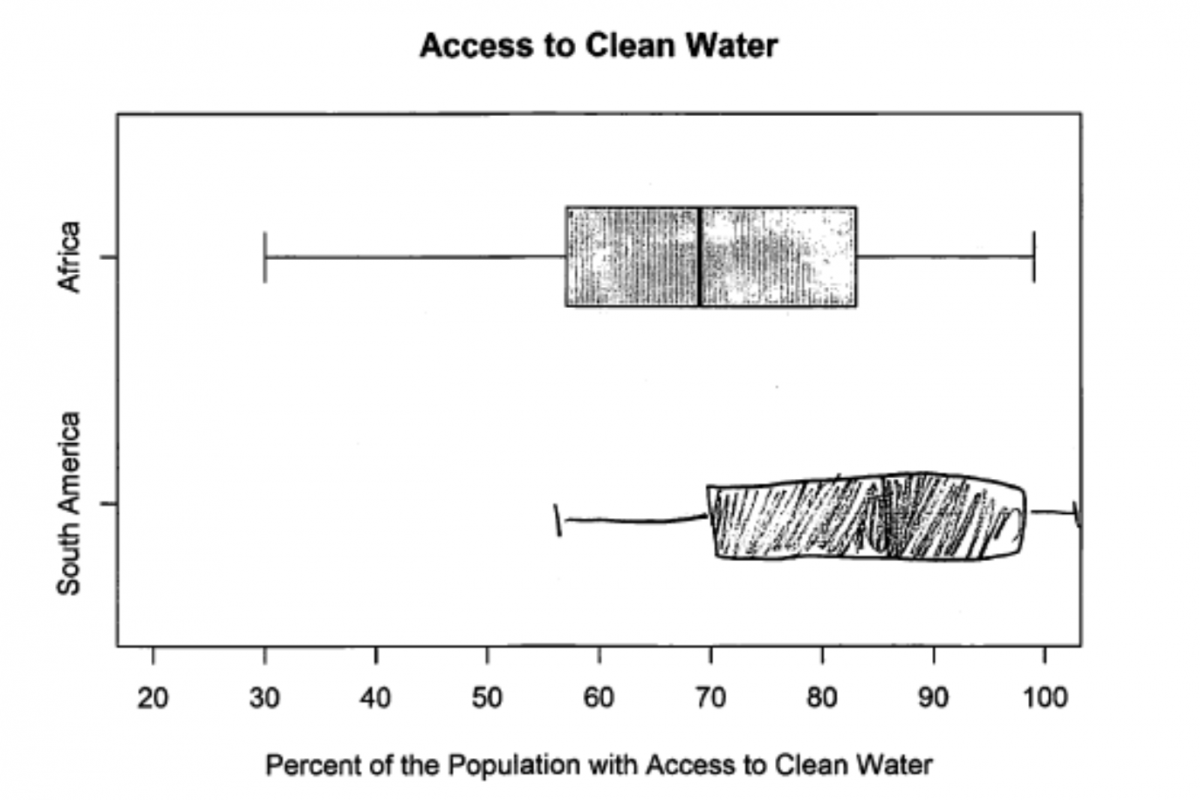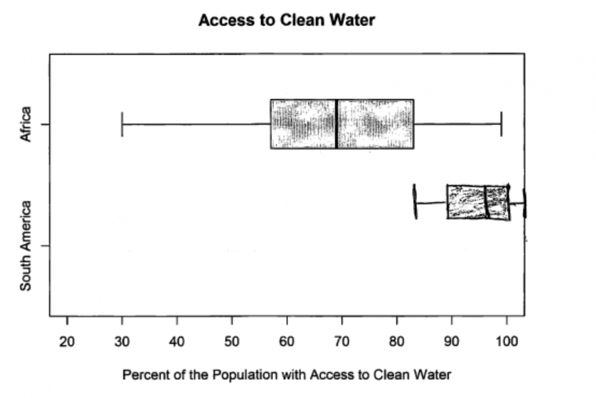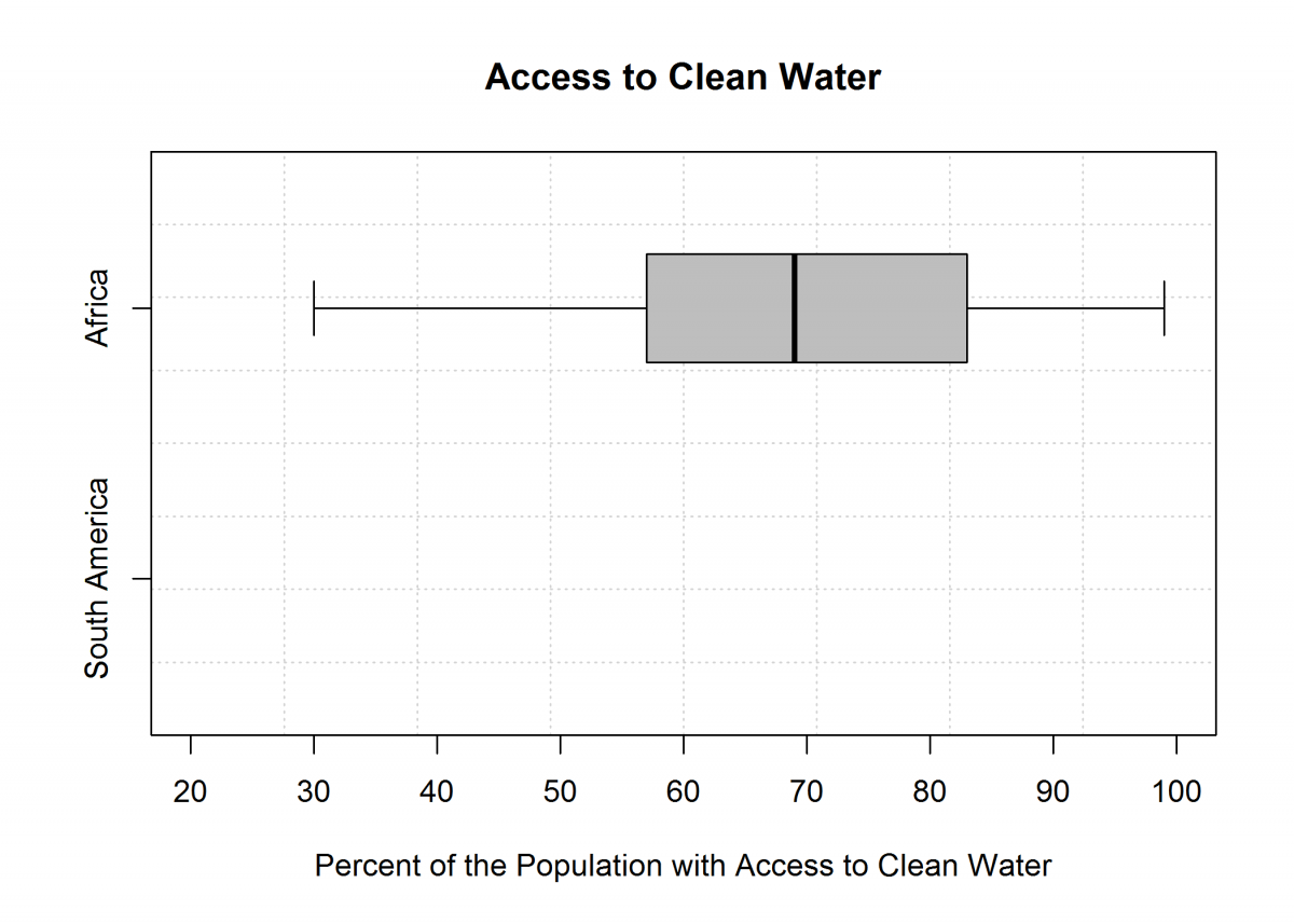 (b) She constructed a boxplot using clean water access data for 51 African countries. Use the data for South American countries to construct a boxplot below the one for African countries.