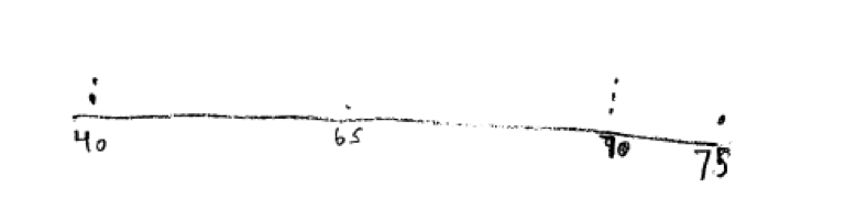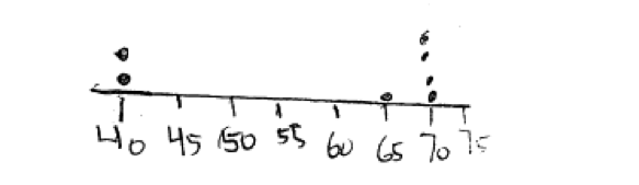 Other students did not use an appropriate scale when constructing the dot plot. For example in the following student response, the scale is not marked correctly, with the distance between 40 and 65 on the scale smaller than the distance from 65 to 75.