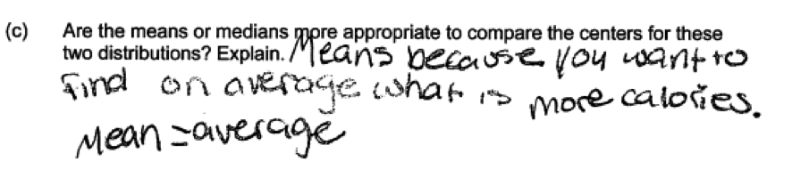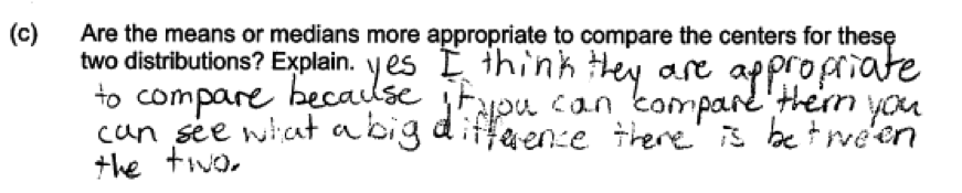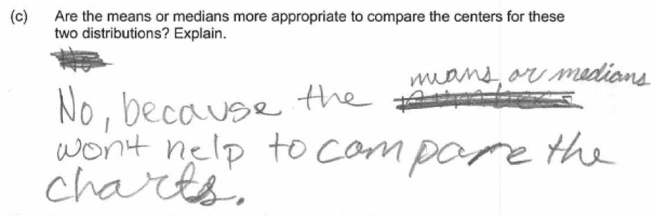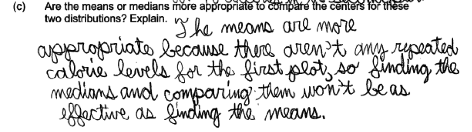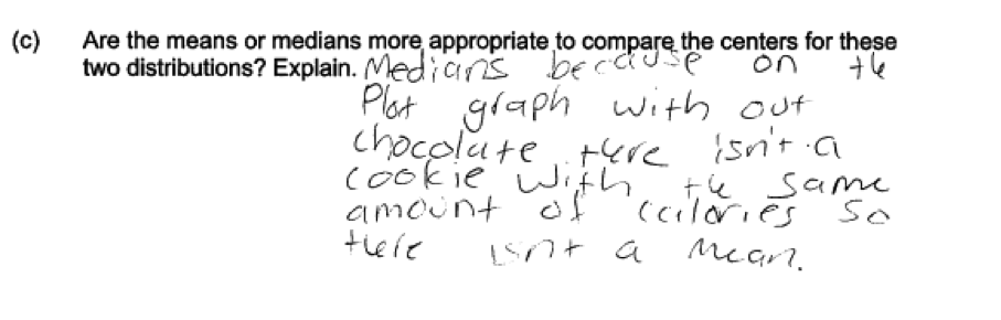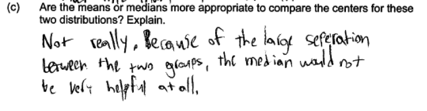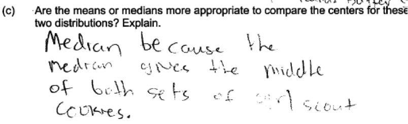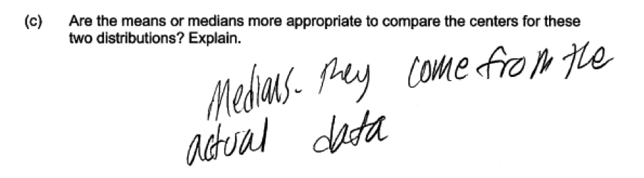 Students made a variety of errors in answering part (c), where they had to indicate whether the mean or the median would be a more appropriate measure of center and explain the choice based on the shape of the distribution or the presence of outliers. Some students correctly chose the median, but provided an explanation for their choice that was incorrect. This is error is illustrated by the following three student responses, all of which were scored as incorrect for part (c) because they did not relate the choice of the measure of center to the shape of the data distribution.