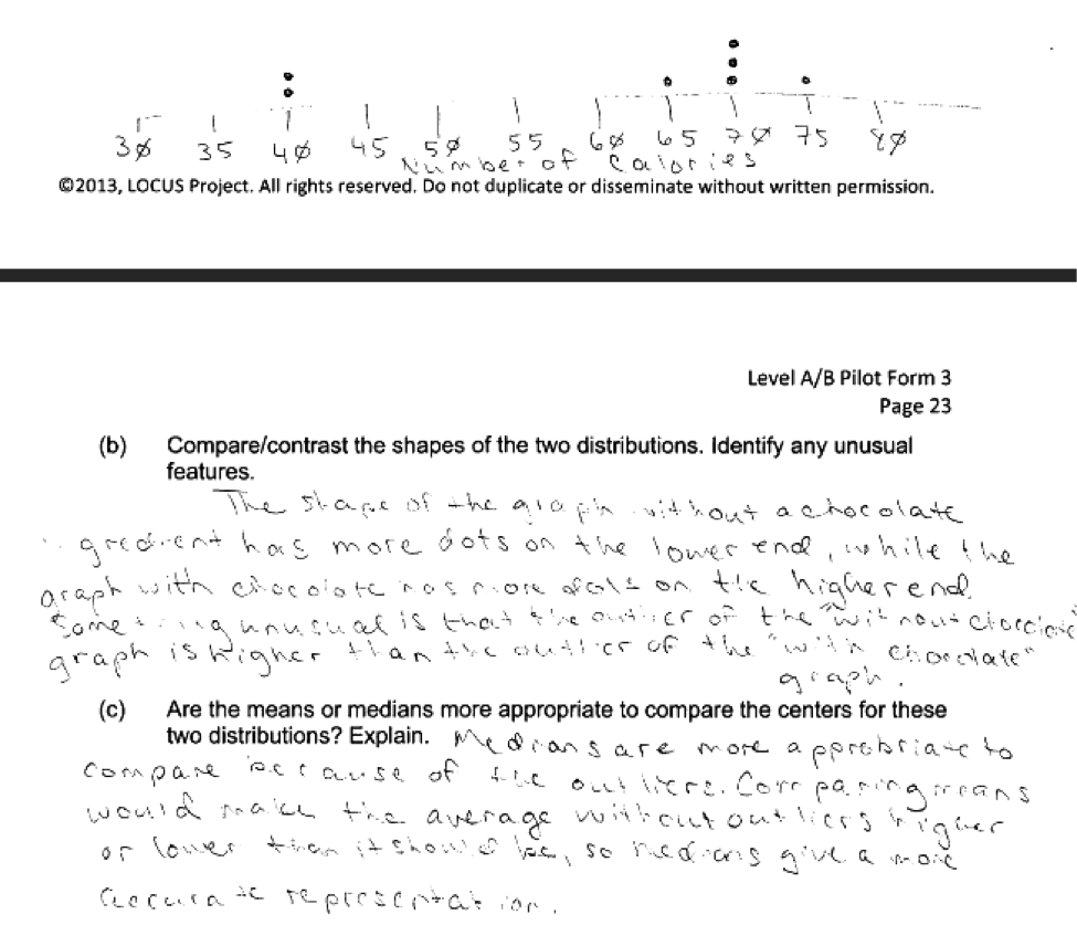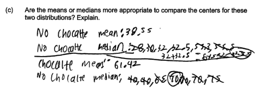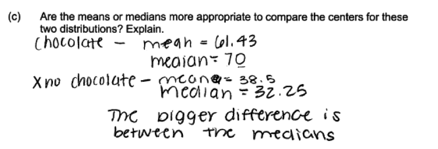 The following student response shows a good understanding of the concepts assessed by parts (a), (b) and (c) of this question. In part (a), the dotplot is drawn correctly with all 7 data values represented in the dot plot and an appropriate scale is shown. In part (b), the response correctly recognizes that the two distributions are skewed and that the direction of the skew is different by saying “without chocolate has more dots on the lower end, while the graph with chocolate has more dots on the higher end.” It also makes note of the outliers. In part (c) the median is chosen as the more appropriate measure of center and the justification is based on the outliers in the two distributions. This response was scored as essentially correct for the combined parts (a) and (b) and for part (c).