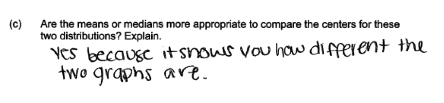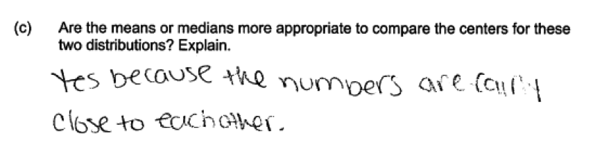 The most common student error was to make an incorrect choice of measure of center with an accompanying explanation that did not relate the choice to shape of the presence of outliers. This is illustrated by the following three student responses. Each of these responses was scored as incorrect for part (c).