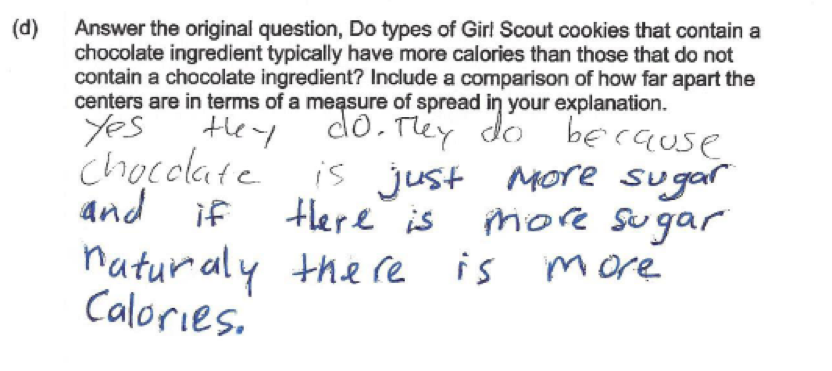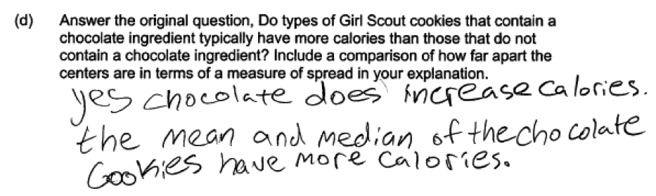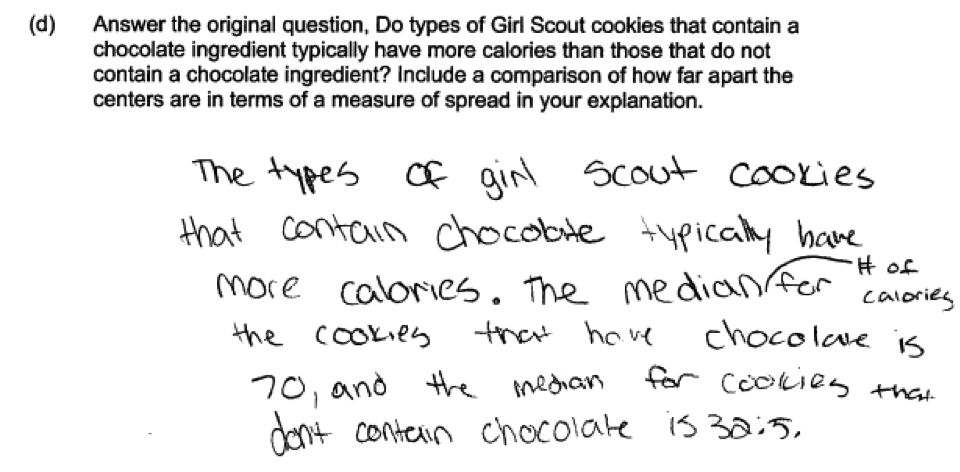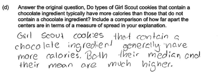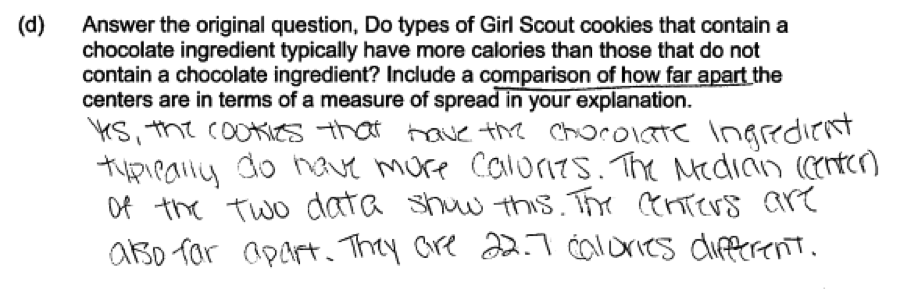 Part (d) asks students to use given summary statistics and the dot plots from the earlier parts to decide if Girl Scout cookies that contain chocolate typically have more calories than those that do not. Students were asked to take the variability in the data into account when making this determination and to explain how they did this as part of their answer. An ideal response to part (d) would indicate that based on the data and summary statistics, Girl Scout cookies that contain chocolate do typically have more calories than those that do not. This decision would be based on relating the difference in medians for the two distributions to an appropriate measure of variability. For example, a student might say that the difference in medians is 37.5 calories, which is about 3 times the MAD or about 1.25 times the IQR. This indicates that the difference in medians is large, relative to the variability in the two data distributions.