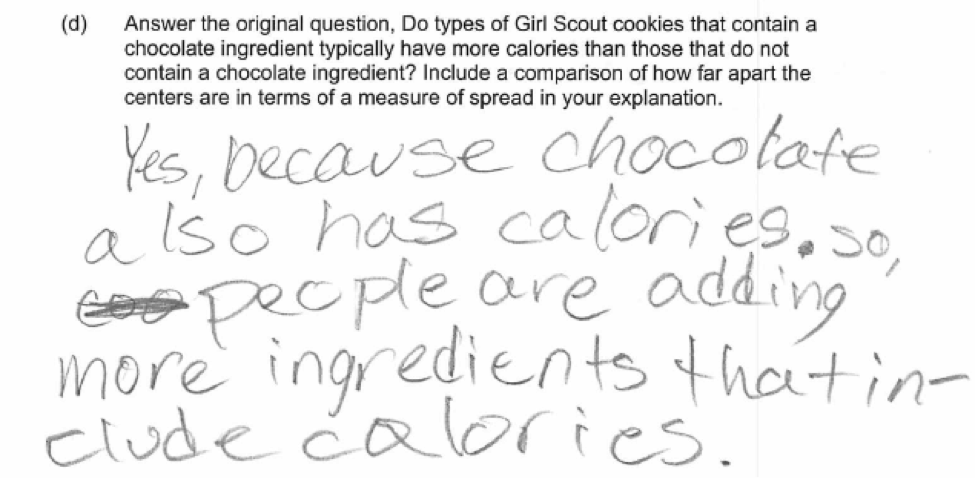 Responses that indicated that Girl Scout cookies that contain chocolate typically have more calories than those that do not, but did not provide a rationale that is based on variability in the two distributions were considered to be only partially correct.