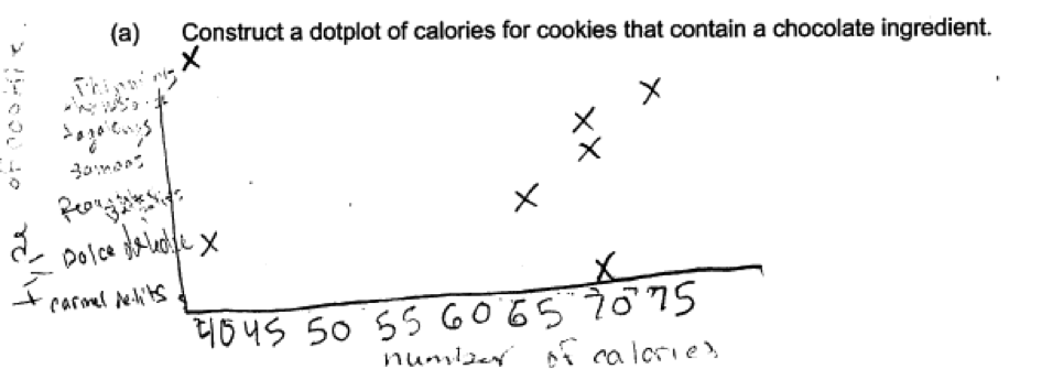 Finally, a number of students did not seem to know what a dot plot was and did not realize that they could model their plot on the dot plot for Girl Scout cookies that did not contain chocolate that was provided. These students produced incorrect graphs or graphs that were not dotplots. For example, the following student response to part (a) made a plot that tries to incorporate the cookie name into the display.