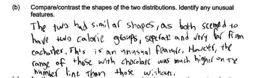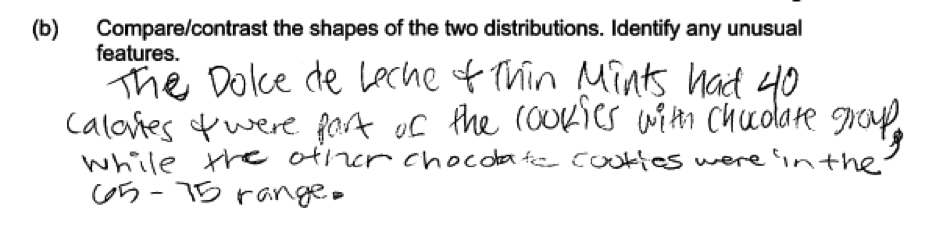 Part (b) asks students to compare the shape of the two distributions. The most common error in part (b) was to just describe the distribution for the data for Girl Scout cookies that contain chocolate. This is illustrated in the following student response, which only describes the with chocolate distribution and fails to compare it to the distribution for the cookies that do not contain chocolate.