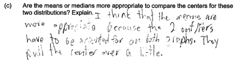 Other students noted that the outliers that are present in both of the distributions would have an impact on the mean, but then still chose the mean as the most appropriate measure of center. As an example of this error, consider the following student response which was scored as partially correct for part (c).