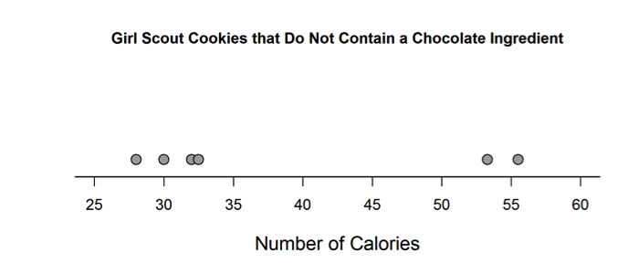 Elizabeth constructed the dotplot below for the number of calories per cookie in cookies that do not contain a chocolate ingredient.
