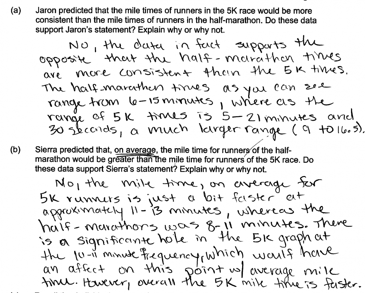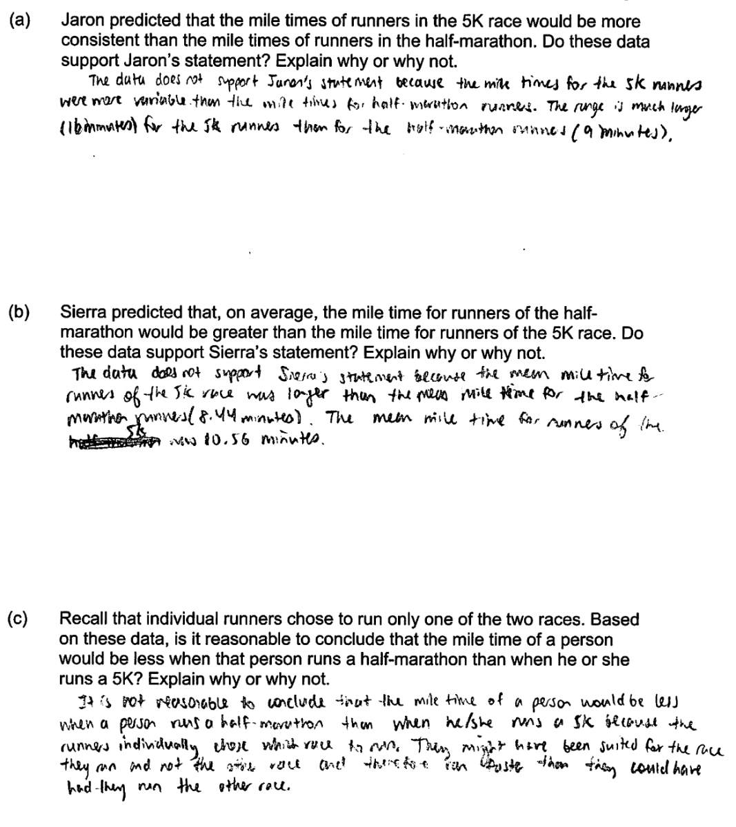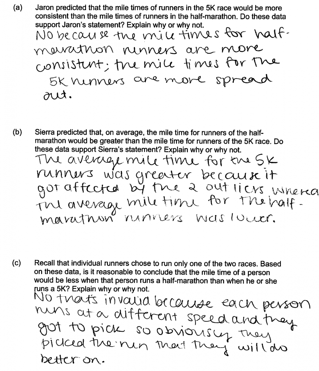 The following student response shows a good understanding of the concepts assessed by this question. In part (a) the response indicates that Jaron’s prediction is not supported and justifies this in terms of “more spread” in the mile times for the 5K runners. In part (b), the response correctly indicates that the average for the 5K race mile times is greater than the average for the mile times for the half-marathon race. The response to part (c) states that the given conclusion is not valid and justifies this based on the fact that runners got to pick which race they would run. All three parts of this response were scored as essentially correct and this student response received a score of 4.