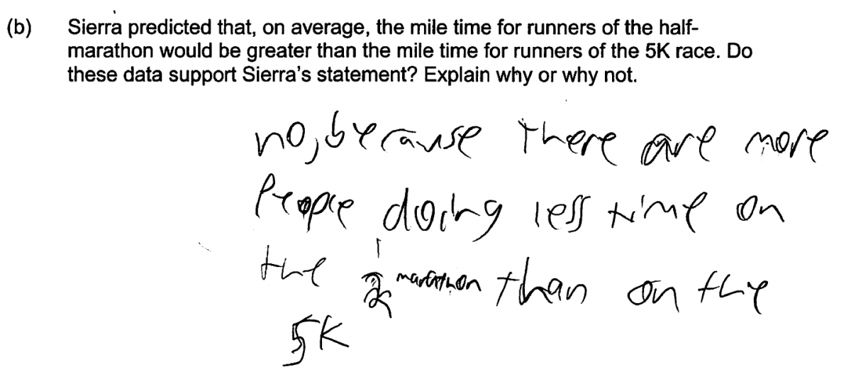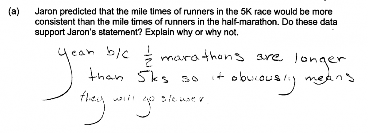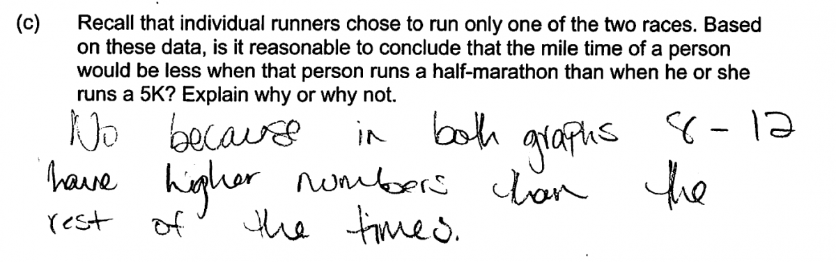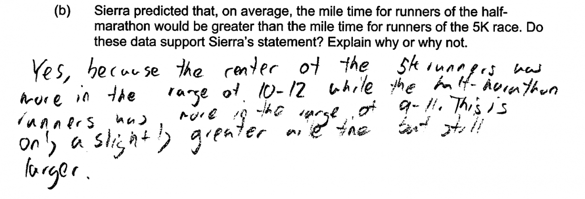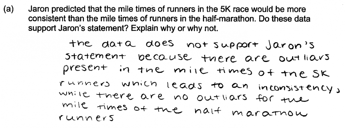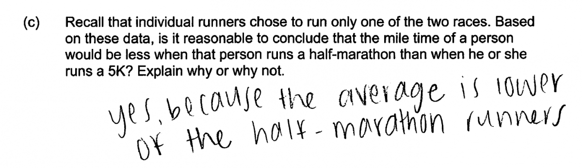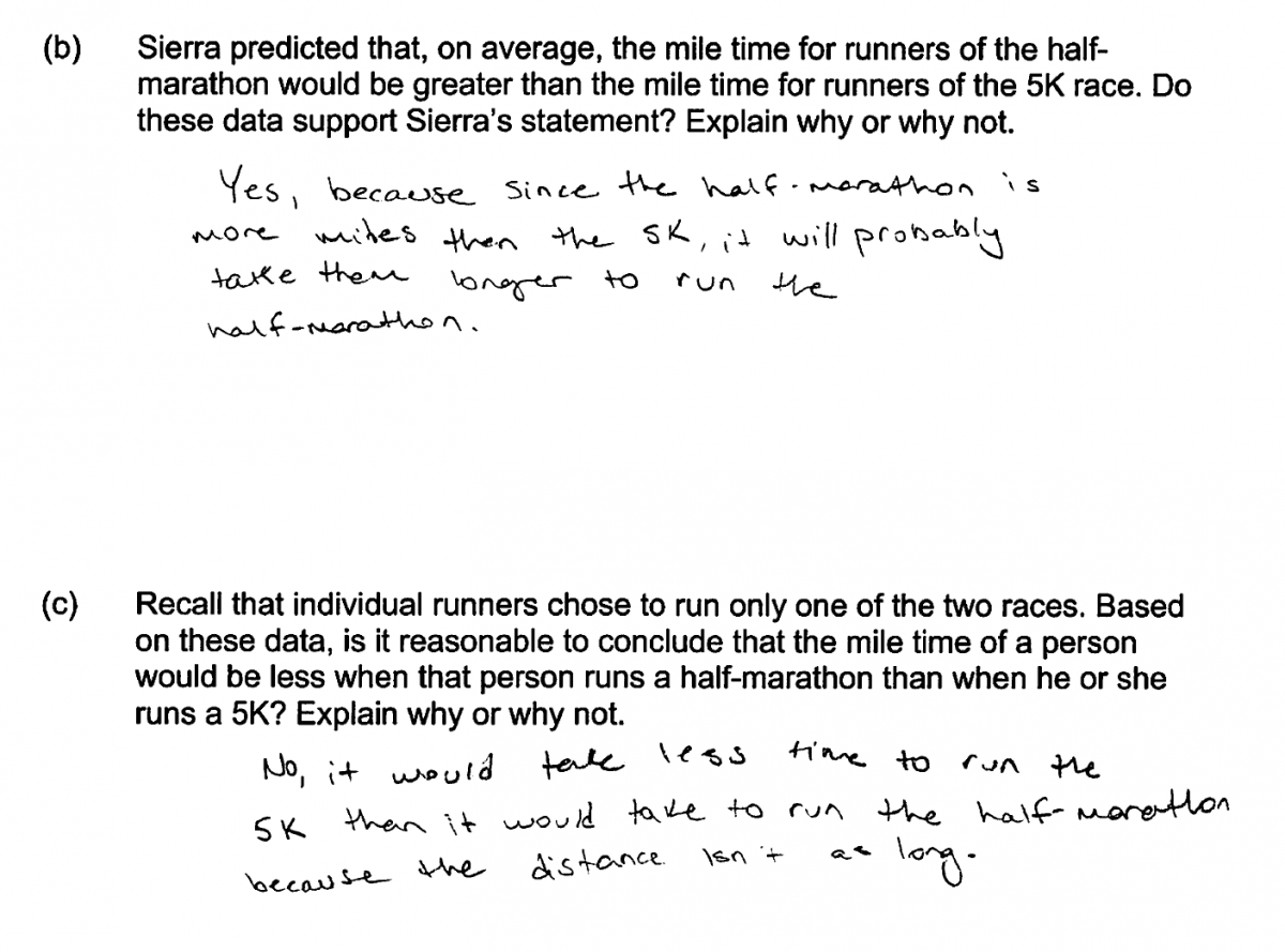 The following student response shows a good understanding of the concepts assessed by this question. In part (a) the response indicates that Jaron’s prediction is not supported and justifies this in terms of “more spread” in the mile times for the 5K runners. In part (b), the response correctly indicates that the average for the 5K race mile times is greater than the average for the mile times for the half-marathon race. The response to part (c) states that the given conclusion is not valid and justifies this based on the fact that runners got to pick which race they would run. All three parts of this response were scored as essentially correct and this student response received a score of 4.