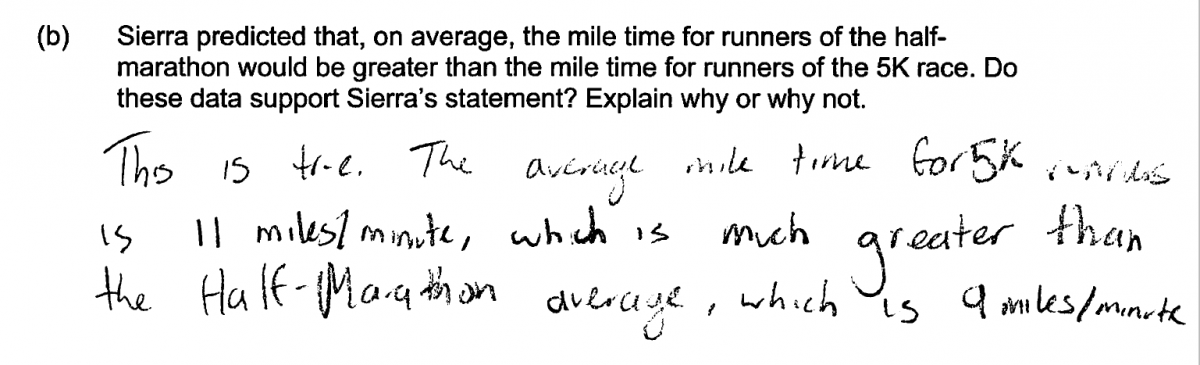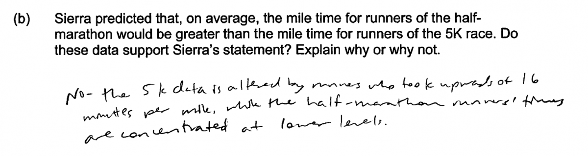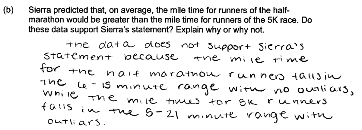 An ideal response to part (b) is one that recognizes that the mean mile time is greater for the mile times for the 5K race than for the half-marathon and indicates that Sierra’s prediction that the mile time, on average, of runners in the half-marathon would be greater than the time, on average, for runners in the 5K race is not correct.