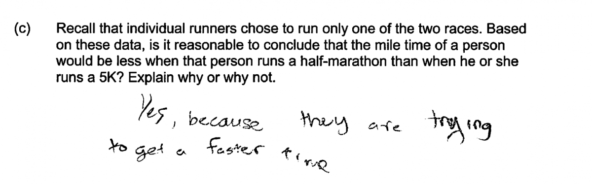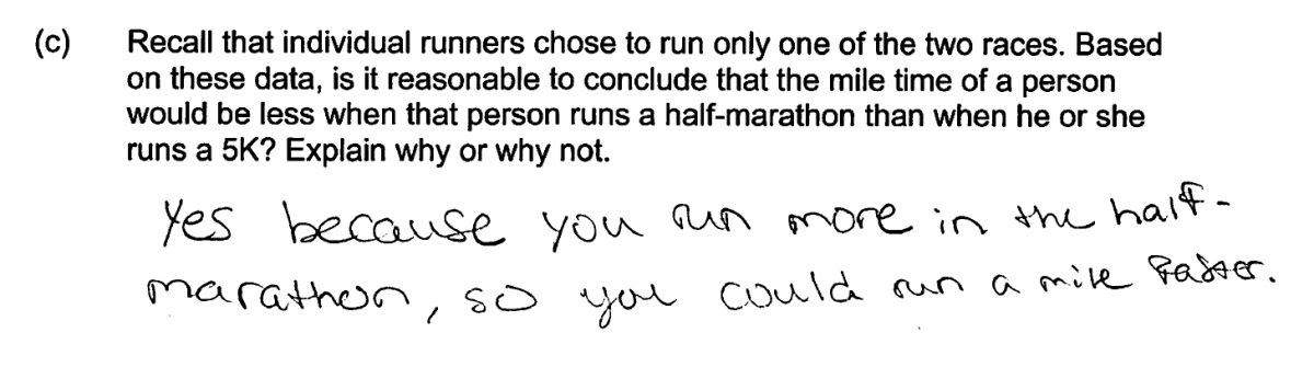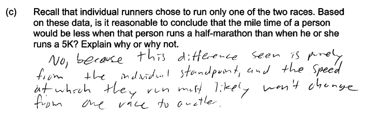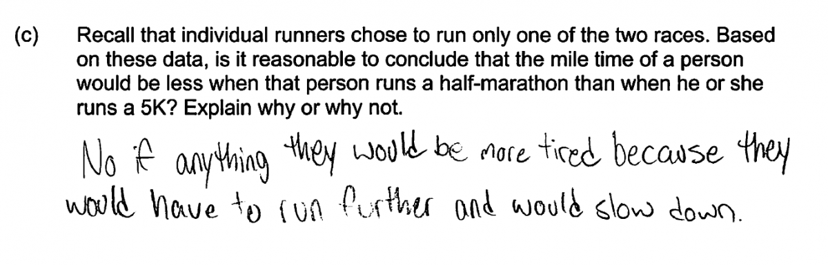 In part (c), students are asked if it is reasonable to conclude that the mile time would be less if a person ran a half-marathon than if that person ran a 5K race. An ideal response indicates that it is not reasonable and provides an explanation that is based on the fact that the runners in these races chose the race in which they would run.