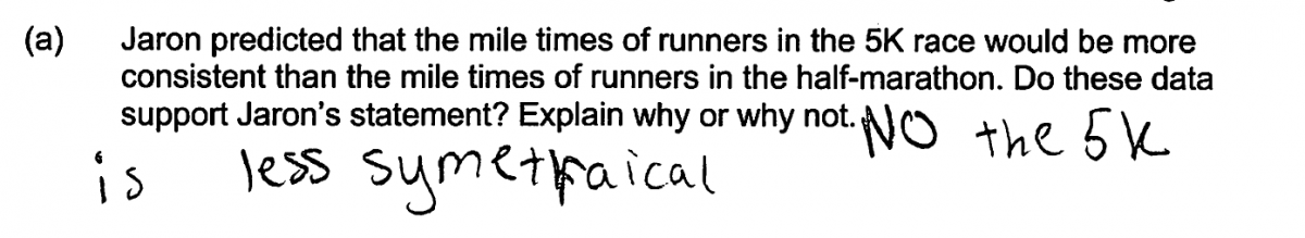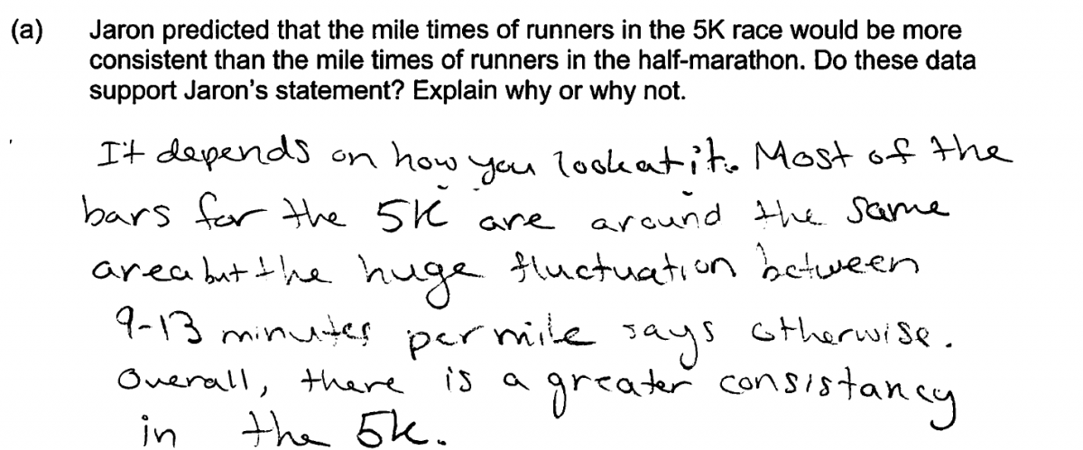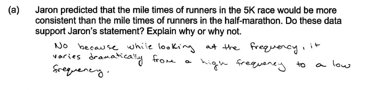 Many students struggled with part (a) of this questions, and we saw a number of different errors in the responses to this question. The most concerning of these errors is illustrated in the three student responses below. In each of these responses, the student has confused variability in the heights of the bars in the histogram (frequencies) with variability in the data (mile times). This represents a clear misunderstanding of how a histogram serves as a graphical summary of a data distribution. Each of these responses was scored incorrect for part (a).